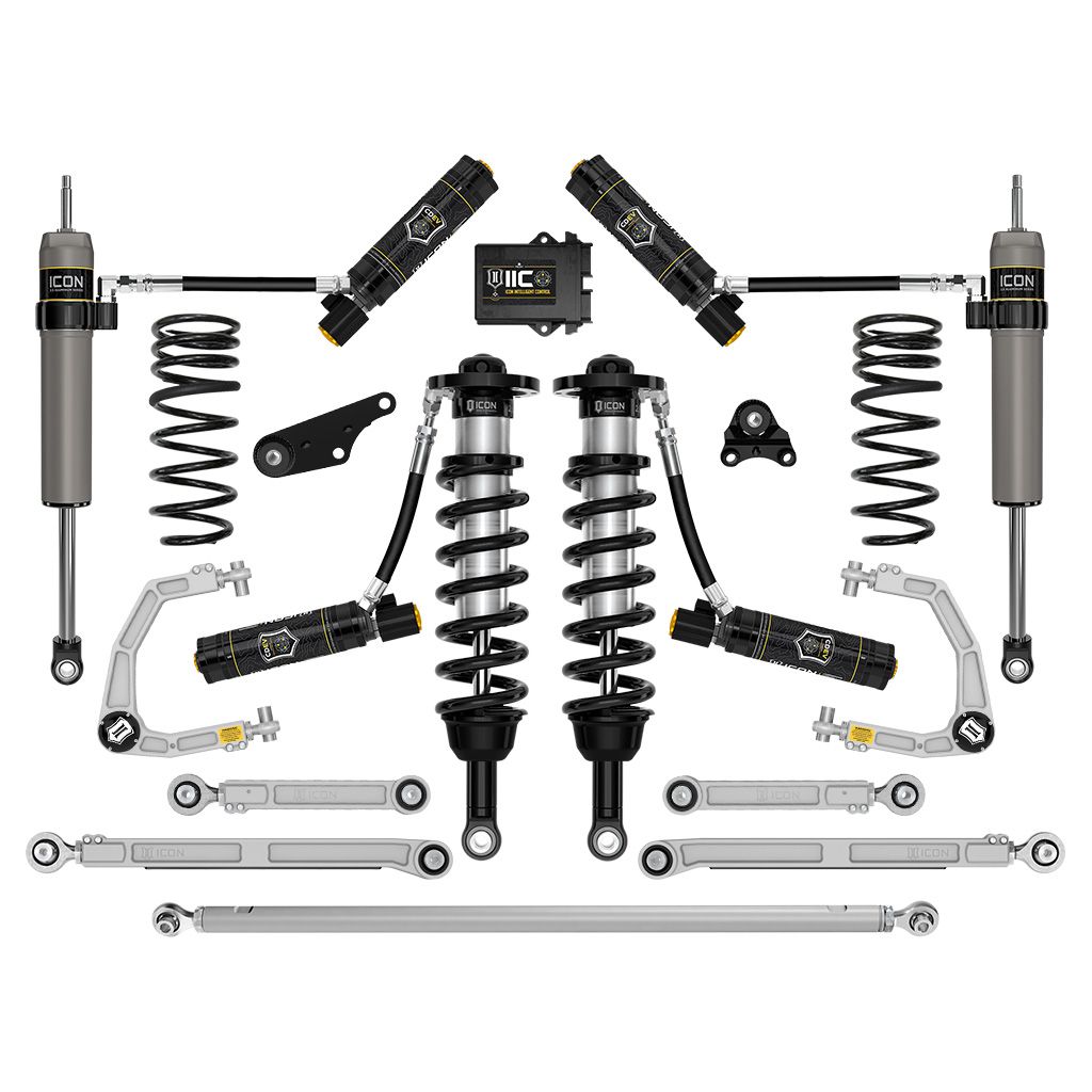 The ICON billet aluminum upper control arm kit is designed to improve the overall performance of the new Tacoma with corrected front-end geometry, increased on-vehicle camber and caster adjustment, and improved suspension component clearance. Replacing the OE ball joint with the all-new, serviceable, and rebuildable ICON Delta Joint PRO allows for full bump and droop travel of the front suspension while eliminating bind. The rear dual rate coil design provides a softer ride rate with a firmer overload rate that combine to deliver on-road comfort with excellent load support, bottoming resistance, and superior off-road performance. These rear springs are designed to net .5" of rear lift over stock with approximately 600lbs of additional weight added to the rear, for a more aggressive stance and increased fender clearance for larger wheels and tires on more outfitted vehicles. ICON billet rear upper and lower links feature on-vehicle adjustability via the ICON double adjuster and employ dual-durometer greaseless bushings at one end, and massive FK rod ends at the other to provide the best combination of free articulation while isolating and damping road noise and vibrations. The ICON Billet Adjustable Rear Track Bar helps re-center the rear axle and double adjuster rod end threads allow easy “on-vehicle” fine adjustment of track bar length without requiring removal or disassembly of the track bar. ICON 2.5 Aluminum Series CDEV remote reservoir rear shocks with integrated bump zones provide improved shock damping ability and utilize a vehicle-specific valving that balances the performance of the truck from front to rear. The ICON Vehicle Dynamics 2024-2025 Toyota Tacoma Stage 13 suspension system is an excellent choice for those drivers looking to enhance the capabilities of their pickup on the road as well as in the dirt.