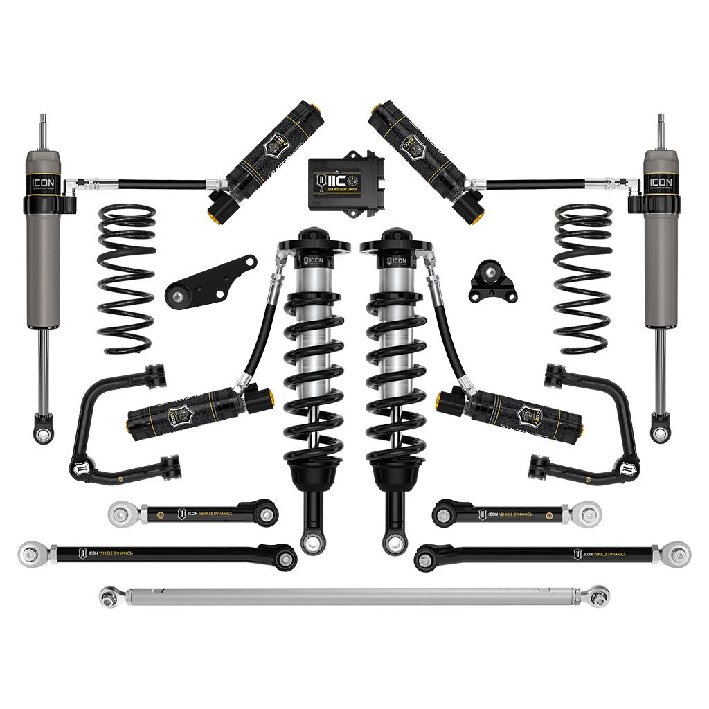 ICON tubular upper control arm kit is designed to improve the overall performance of the new 2024-2025 Toyota Tacoma with corrected front-end geometry, built in additional caster, and improved suspension component clearance. Replacing the OE ball joint with the all-new, serviceable, and rebuildable ICON Delta Joint PRO allows for full bump and droop travel of the front suspension while eliminating bind. The rear triple-rate coil design provides a softer droop and ride rates with a firmer overload rate that combine to deliver on-road comfort with excellent bottoming resistance and superior off-road performance. ICON tubular rear upper and lower links employ dual-durometer greaseless bushings at one end, and massive FK rod ends at the other to provide the best combination of free articulation while isolating and damping road noise and vibrations. The ICON Billet Adjustable Rear Track Bar helps re-center the rear axle and double adjuster rod end threads allow easy “on-vehicle” fine adjustment of track bar length without requiring removal or disassembly of the track bar. ICON 2.5 Aluminum Series CDEV remote reservoir rear shocks with integrated bump zones provide improved shock damping ability and utilize a vehicle-specific valving that balances the performance of the truck from front to rear. The ICON Vehicle Dynamics 2024-2025 Toyota Tacoma Stage 13 suspension system is an excellent choice for those drivers looking to enhance the capabilities of their pickup on the road as well as in the dirt.