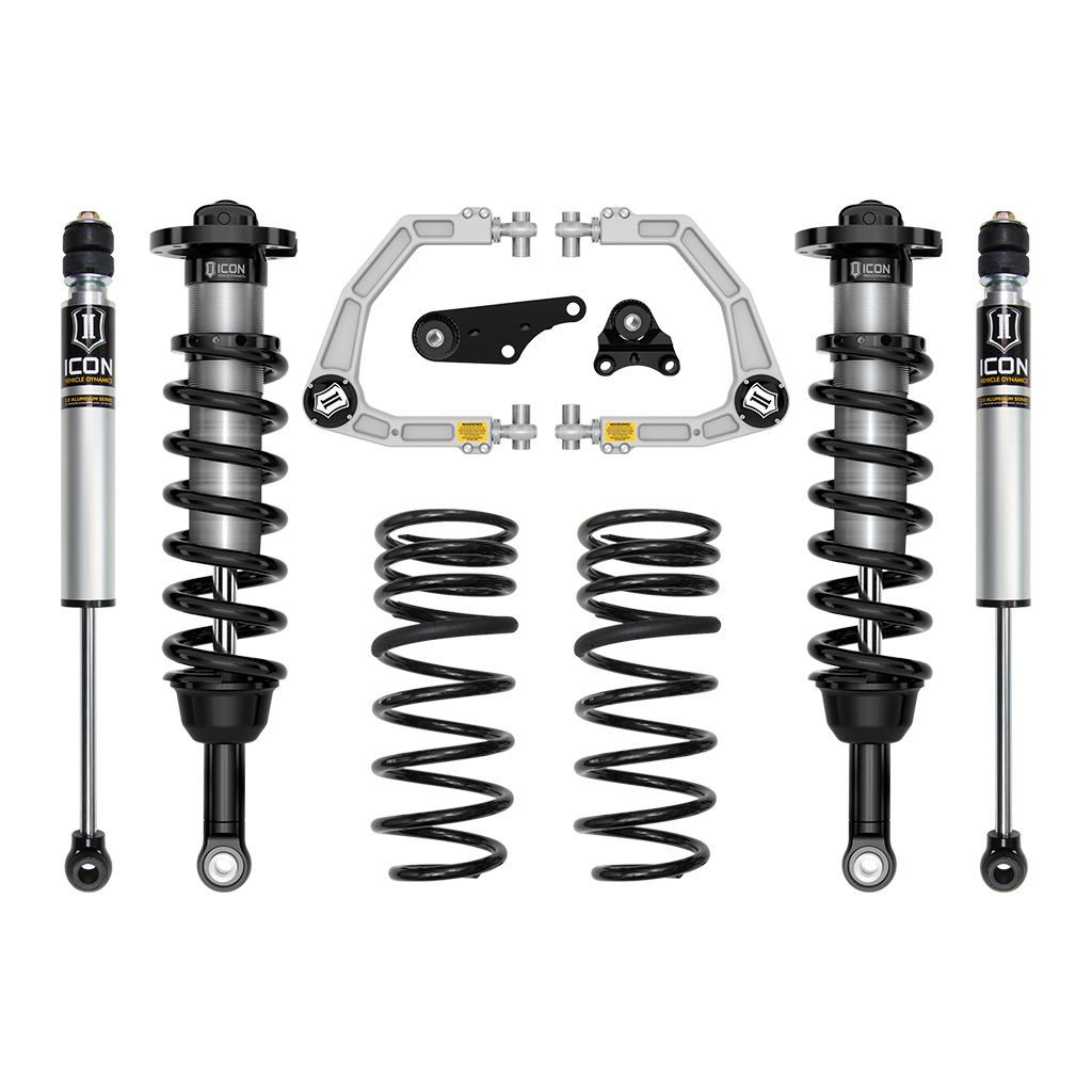 The ICON billet aluminum upper control arm kit is designed to improve the overall performance of the new 2024 Toyota Tacoma with corrected front-end geometry, increased on-vehicle camber and caster adjustment, and improved suspension component clearance. Replacing the OE ball joint with the all-new, serviceable, and rebuildable ICON Delta Joint PRO allows for full bump and droop travel of the front suspension while eliminating bind. The rear triple-rate coil design provides a softer droop and ride rates with a firmer overload rate that combine to deliver on-road comfort with excellent bottoming resistance and superior off-road performance. ICON 2.0 Aluminum Series internal reservoir rear shocks utilize a vehicle-specific valving that balances the performance of the truck from front to rear. The ICON Vehicle Dynamics 2024-2025 Toyota Tacoma Stage 2 suspension system is an excellent choice for those drivers looking to enhance the capabilities of their pickup on the road as well as in the dirt.