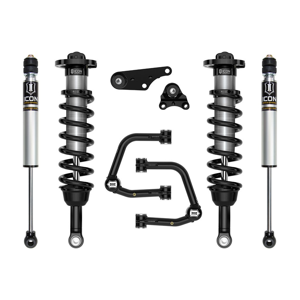 ICON Vehicle Dynamics 2024-2025 Toyota Tacoma suspension systems are designed with maximum performance and the serious driver in mind. ICON engineers’ primary focus is to increase wheel travel and damping ability, which translates into outstanding vehicle control and ride quality both on- and off-road. This Stage 2 system includes vehicle-specific tuned 2.5 Series coilover shocks featuring internal reservoirs for exceptional cooling properties and ICON-engineered coil springs for superior vehicle “feel” through the range of travel. These coilovers are height adjustable from 1.25-3” of front lift height over stock, allowing the use of larger, more aggressive wheel and tire combinations. The combination of front differential drop brackets and ICON’s specifically designed coilover lengths maximizes the available front suspension travel and prevent CV bind. Additionally, polyurethane differential mounting bushings replace the soft OE bushings to help limit differential movement under load. The included ICON tubular upper control arm kit is designed to improve the overall performance of the new 2024 Toyota Tacoma with corrected front-end geometry, built in additional caster, and improved suspension component clearance. Additionally, replacing the OE ball joint with the all-new, serviceable, and rebuildable ICON Delta Joint PRO allows for full bump and droop travel of the front suspension while eliminating bind. ICON 2.0 Aluminum Series internal reservoir rear shocks utilize a vehicle-specific valving that balances the performance of the truck from front to rear. The ICON Vehicle Dynamics 2024-2025 Toyota Tacoma Stage 2 suspension system is an excellent choice for those drivers looking to enhance the capabilities of their pickup on the road as well as in the dirt.