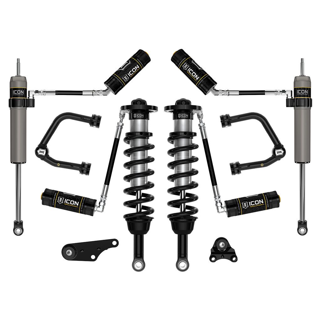 ICON Vehicle Dynamics 2024-2025 Toyota Tacoma suspension systems are designed with maximum performance and the serious driver in mind. ICON engineers’ primary focus is to increase wheel travel and damping ability, which translates into outstanding vehicle control and ride quality both on- and off-road. This Stage 4 system includes vehicle-specific tuned 2.5 Series coilover shocks featuring remote reservoirs and ICON-engineered coil springs for superior vehicle “feel” through the range of travel. Remote reservoirs greatly increase shock oil volume and heat dissipation surface area to resist overheating and cavitation under hard use, which can lead to damper fade. These coilovers are also height adjustable from 1.25-3” of front lift height over stock, allowing the use of larger, more aggressive wheel and tire combinations. The combination of front differential drop brackets and ICON’s specifically designed coilover lengths maximizes the available front suspension travel and prevent CV bind. Additionally, polyurethane differential mounting bushings replace the soft OE bushings to help limit differential movement under load. The included ICON tubular upper control arm kit is designed to improve the overall performance of the new 2024-2025 Toyota Tacoma with corrected front-end geometry, built in additional caster, and improved suspension component clearance. Additionally, replacing the OE ball joint with the all-new, serviceable, and rebuildable ICON Delta Joint PRO allows for full bump and droop travel of the front suspension while eliminating bind. ICON 2.5 Aluminum Series remote reservoir rear shocks with integrated bump zones provide improved shock damping ability and utilize a vehicle-specific valving that balances the performance of the truck from front to rear. The ICON Vehicle Dynamics 2024-2025 Toyota Tacoma Stage 4 suspension system is an excellent choice for those drivers looking to enhance the capabilities of their pickup on the road as well as in the dirt.