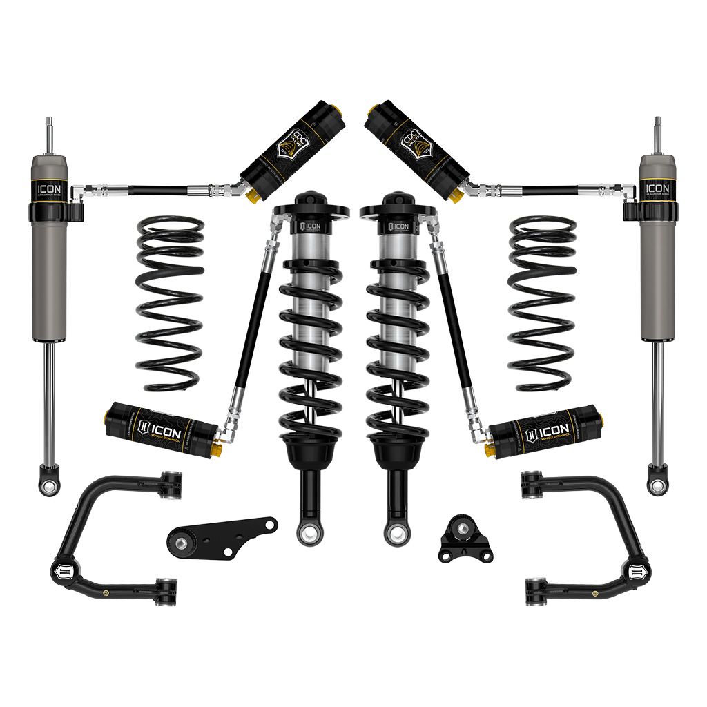 ICON tubular upper control arm kit is designed to improve the overall performance of the new 2024-2025 Toyota Tacoma with corrected front-end geometry, built in additional caster, and improved suspension component clearance. Replacing the OE ball joint with the all-new, serviceable, and rebuildable ICON Delta Joint PRO allows for full bump and droop travel of the front suspension while eliminating bind. The rear dual rate coil design provides a softer ride rate with a firmer overload rate that combine to deliver on-road comfort with excellent load support, bottoming resistance, and superior off-road performance. These rear springs are designed to net .5" of rear lift over stock with approximately 600lbs of additional weight added to the rear, for a more aggressive stance and increased fender clearance for larger wheels and tires on more outfitted vehicles. ICON 2.5 Aluminum Series CDCV remote reservoir rear shocks with integrated bump zones provide improved shock damping ability and utilize a vehicle-specific valving that balances the performance of the truck from front to rear. The ICON Vehicle Dynamics 2024-2025 Toyota Tacoma Stage 5 suspension system is an excellent choice for those drivers looking to enhance the capabilities of their pickup on the road as well as in the dirt.