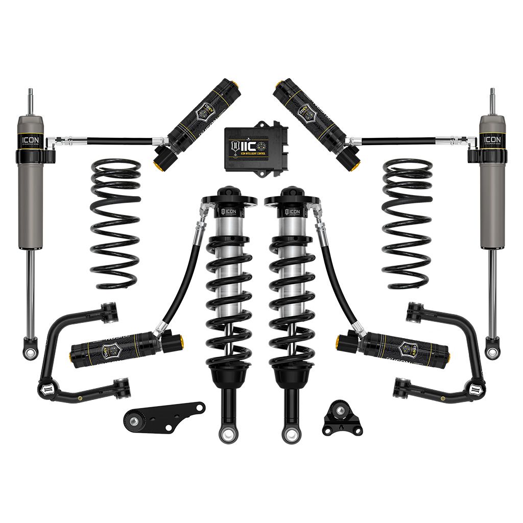 ICON tubular upper control arm kit is designed to improve the overall performance of the new 2024-2025 Toyota Tacoma with corrected front-end geometry, built in additional caster, and improved suspension component clearance. Replacing the OE ball joint with the all-new, serviceable, and rebuildable ICON Delta Joint PRO allows for full bump and droop travel of the front suspension while eliminating bind. The rear dual rate coil design provides a softer ride rate with a firmer overload rate that combine to deliver on-road comfort with excellent load support, bottoming resistance, and superior off-road performance. These rear springs are designed to net .5" of rear lift over stock with approximately 600lbs of additional weight added to the rear, for a more aggressive stance and increased fender clearance for larger wheels and tires on more outfitted vehicles. ICON 2.5 Aluminum Series CDEV remote reservoir rear shocks with integrated bump zones provide improved shock damping ability and utilize a vehicle-specific valving that balances the performance of the truck from front to rear. The ICON Vehicle Dynamics 2024-2025 Toyota Tacoma Stage 6 suspension system is an excellent choice for those drivers looking to enhance the capabilities of their pickup on the road as well as in the dirt.