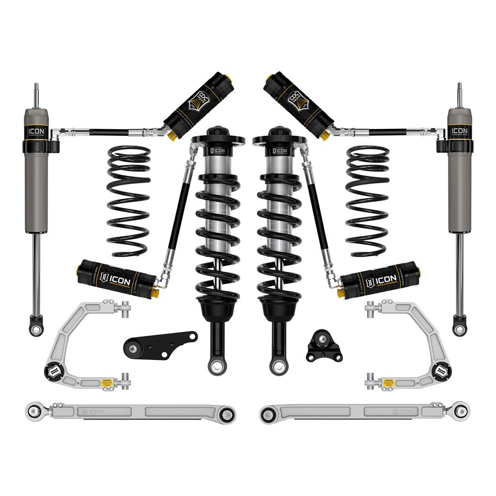 The ICON billet aluminum upper control arm kit is designed to improve the overall performance of the new Tacoma with corrected front-end geometry, increased on-vehicle camber and caster adjustment, and improved suspension component clearance. Replacing the OE ball joint with the all-new, serviceable, and rebuildable ICON Delta Joint PRO allows for full bump and droop travel of the front suspension while eliminating bind. The rear triple-rate coils provide softer droop and ride rates with a firmer overload rate that combine to deliver on-road comfort with excellent bottoming resistance and superior off-road performance. ICON billet rear lower links feature on-vehicle adjustability via the ICON double adjuster and employ dual-durometer greaseless bushings at one end, and massive FK rod ends at the other to provide the best combination of free articulation while isolating and damping road noise and vibrations. ICON 2.5 Aluminum Series CDCV remote reservoir rear shocks with integrated bump zones provide improved shock damping ability and utilize a vehicle-specific valving that balances the performance of the truck from front to rear. The ICON Vehicle Dynamics 2024-2025 Toyota Tacoma Stage 8 suspension system is an excellent choice for those drivers looking to enhance the capabilities of their pickup on the road as well as in the dirt.