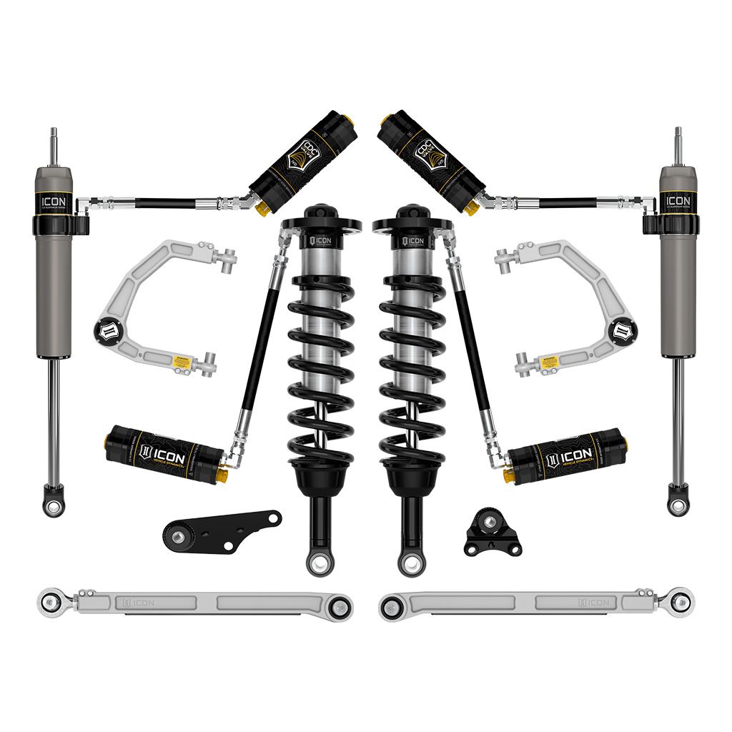 The included ICON billet aluminum upper control arm kit is designed to improve the overall performance of the new 2024-2025 Toyota Tacoma with corrected front-end geometry, increased on-vehicle camber and caster adjustment, and improved suspension component clearance. Replacing the OE ball joint with the all-new, serviceable, and rebuildable ICON Delta Joint PRO allows for full bump and droop travel of the front suspension while eliminating bind. ICON billet rear lower links feature on-vehicle adjustability via the ICON double adjuster and employ dual-durometer greaseless bushings at one end, and massive FK rod ends at the other to provide the best combination of free articulation while isolating and damping road noise and vibrations. ICON 2.5 Aluminum Series CDCV remote reservoir rear shocks with integrated bump zones provide improved shock damping ability and utilize a vehicle-specific valving that balances the performance of the truck from front to rear. The ICON Vehicle Dynamics 2024-2025 Toyota Tacoma Stage 8 suspension system is an excellent choice for those drivers looking to enhance the capabilities of their pickup on the road as well as in the dirt.