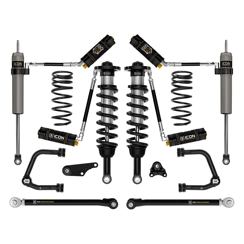 ICON tubular upper control arm kit is designed to improve the overall performance of the new 2024-2025 Toyota Tacoma with corrected front-end geometry, built in additional caster, and improved suspension component clearance. Replacing the OE ball joint with the all-new, serviceable, and rebuildable ICON Delta Joint PRO allows for full bump and droop travel of the front suspension while eliminating bind. The rear dual rate coil design provides a softer ride rate with a firmer overload rate that combine to deliver on-road comfort with excellent load support, bottoming resistance, and superior off-road performance. These rear springs are designed to net .5" of rear lift over stock with approximately 600lbs of additional weight added to the rear, for a more aggressive stance and increased fender clearance for larger wheels and tires on more outfitted vehicles. ICON tubular rear lower links employ dual-durometer greaseless bushings at one end, and massive FK rod ends at the other to provide the best combination of free articulation while isolating and damping road noise and vibrations. ICON 2.5 Aluminum Series CDCV remote reservoir rear shocks with integrated bump zones provide improved shock damping ability and utilize a vehicle-specific valving that balances the performance of the truck from front to rear. The ICON Vehicle Dynamics 2024 Toyota Tacoma Stage 8 suspension system is an excellent choice for those drivers looking to enhance the capabilities of their pickup on the road as well as in the dirt.