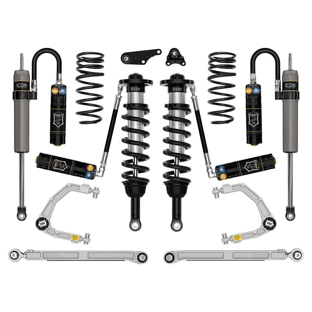 The ICON billet aluminum upper control arm kit is designed to improve the overall performance of the new Tacoma with corrected front-end geometry, increased on-vehicle camber and caster adjustment, and improved suspension component clearance. Replacing the OE ball joint with the all-new, serviceable, and rebuildable ICON Delta Joint PRO allows for full bump and droop travel of the front suspension while eliminating bind. The rear triple-rate coils provide softer droop and ride rates with a firmer overload rate that combine to deliver on-road comfort with excellent bottoming resistance and superior off-road performance. ICON billet rear lower links feature on-vehicle adjustability via the ICON double adjuster and employ dual-durometer greaseless bushings at one end, and massive FK rod ends at the other to provide the best combination of free articulation while isolating and damping road noise and vibrations. ICON 2.5 Aluminum Series CDXS remote reservoir rear shocks with integrated bump zones provide improved shock damping ability and utilize a vehicle-specific valving that balances the performance of the truck from front to rear. The ICON Vehicle Dynamics 2024-2025 Toyota Tacoma Stage 8 suspension system is an excellent choice for those drivers looking to enhance the capabilities of their pickup on the road as well as in the dirt.