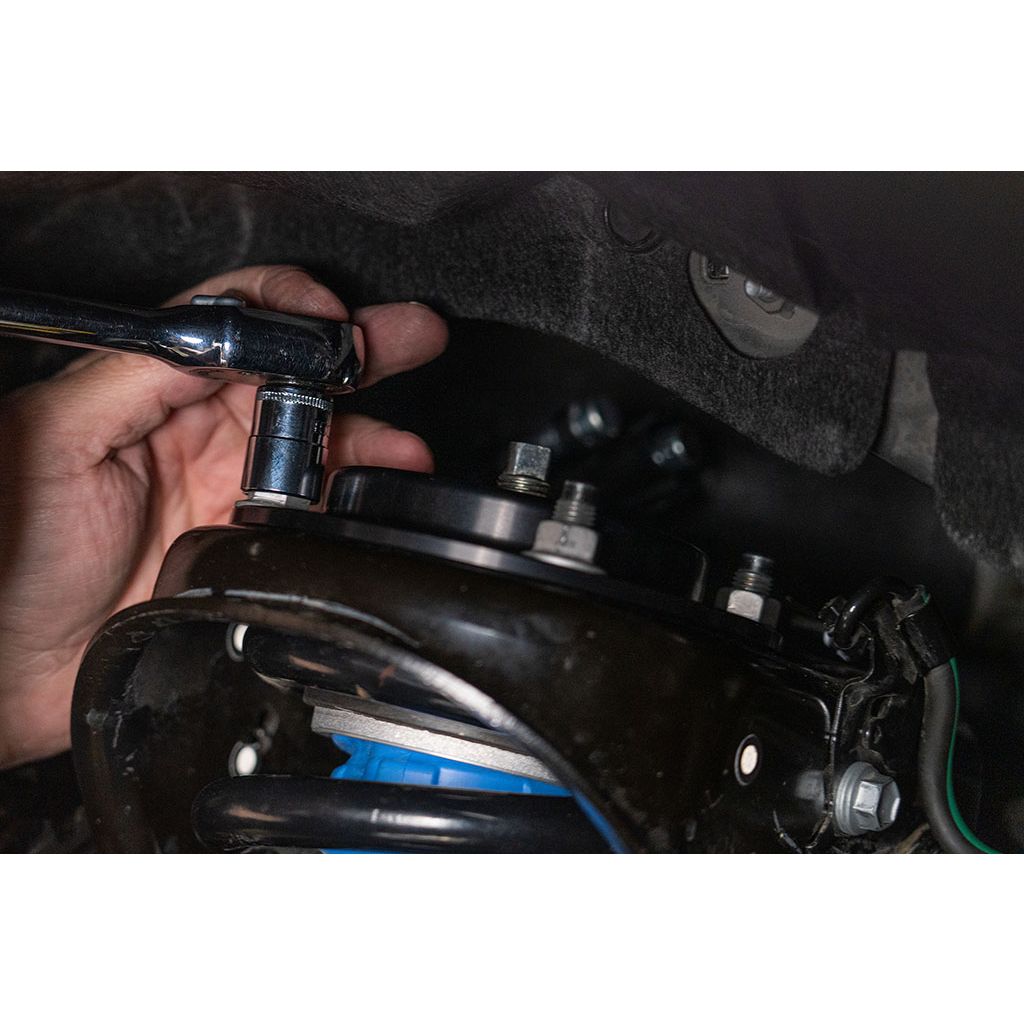 The Top Plate Reinforcement is quick and easy to install, as there is no need to jack up the vehicle or even remove the tire (though we removed the tire for these photos to provide a clear view). Simply remove the three coilover top mount nuts, install the Top Plate Reinforcement, and re-torque the nuts. The reinforcement plate is CNC machined from 6061-T6 billet aluminum. It does not affect or limit the factory suspension performance in any way.