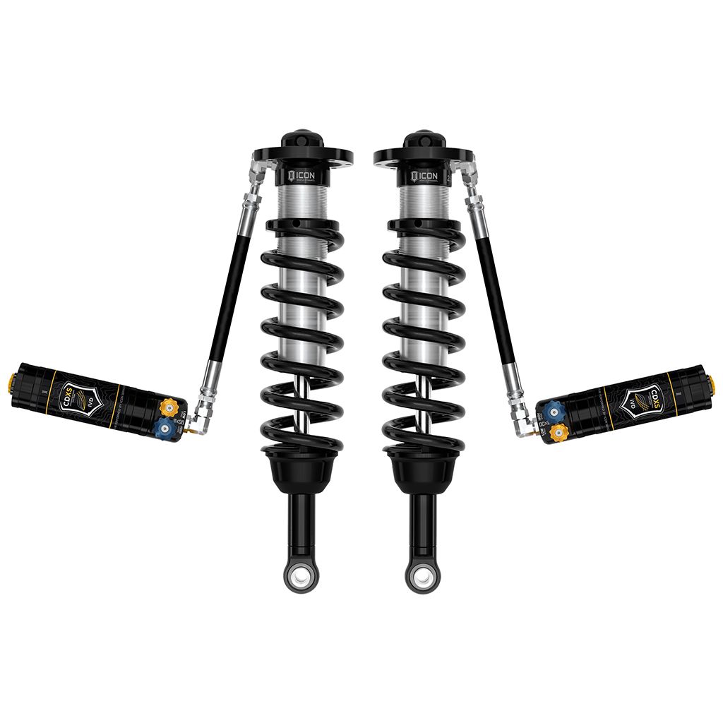 ICON Vehicle Dynamics V.S. 2.5 Series remote reservoir front coilover shocks are an incredible upgrade for the front end of the 2024-2025 Toyota Tacoma. These adjustable coilovers allow up 1.25-3” of lift height adjustability, allowing the use of larger, more aggressive wheel and tire combinations. ICON’s Vehicle-specific shock length and valving, their large 2.5” shock body with increased piston surface area over stock components, and their pairing with an ICON front differential drop (4WD only), yield the maximum travel possible along with superior ride quality and suspension performance both on- and off-road. Remote reservoirs greatly increase shock oil volume and heat dissipation surface area to resist overheating and cavitation under hard use, which can lead to damper fade. ICON's exclusive Compression Damping Dual Speed (CDXS) valves are included for precisely dialing in your suspension performance. CDXS controls fluid flow under compression, with independent adjustability of high speed and low speed compression force. 10 discreet detented settings for both low and high-speed adjustment knobs allow separate adjustments for handling response and overall aggressiveness. When paired with ICON 2.0 or 2.5 Aluminum Series rear shock absorbers vehicle control will be balanced front to rear, resulting in the best overall driving experience for your Toyota Tacoma.