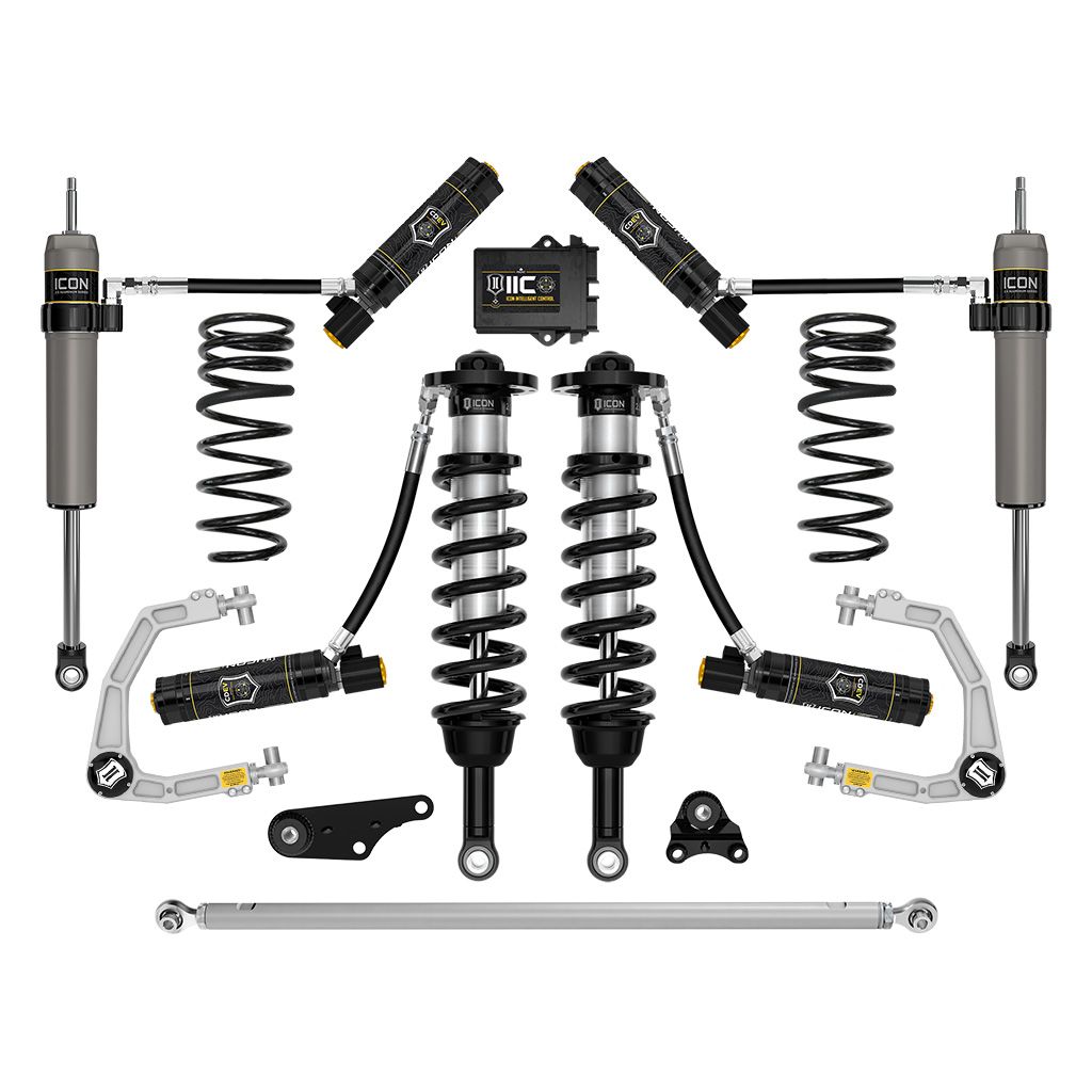 The included ICON billet aluminum upper control arm kit is designed to improve overall performance with corrected front-end geometry, increased on-vehicle camber and caster adjustment, and improved suspension component clearance. Additionally, replacing the OE ball joint with the all-new, serviceable, and rebuildable ICON Delta Joint PRO allows for full bump and droop travel of the front suspension while eliminating bind. The dual-rate rear coil design provides a softer ride height spring rate with a firmer overload rate that combine to deliver on-road comfort with excellent bottoming resistance and superior off-road performance while .75” of rear lift height over stock allows a for level stance front to rear. The ICON Billet Adjustable Rear Track Bar helps re-center the rear axle and double adjuster rod end threads allow easy "on-vehicle" fine adjustment of track bar length without requiring removal or disassembly of the track bar. ICON 2.5 Aluminum Series remote reservoir CDEV rear shocks with integrated bump zones provide improved shock damping ability and utilize a vehicle-specific valving that balances the performance of the truck from front to rear. The ICON Vehicle Dynamics 2025 Toyota 4Runner Stage 12 suspension system is an excellent choice for those drivers looking to enhance the capabilities of their pickup on the road as well as in the dirt.