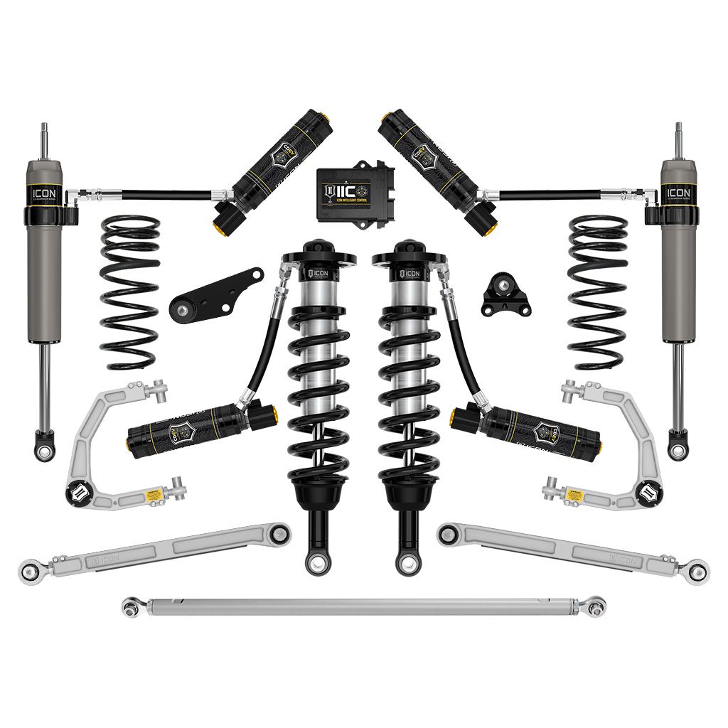 The included ICON billet aluminum upper control arm kit is designed to improve overall performance with corrected front-end geometry, increased on-vehicle camber and caster adjustment, and improved suspension component clearance. Additionally, replacing the OE ball joint with the all-new, serviceable, and rebuildable ICON Delta Joint PRO allows for full bump and droop travel of the front suspension while eliminating bind. The dual-rate rear coil design provides a softer ride height spring rate with a firmer overload rate that combine to deliver on-road comfort with excellent bottoming resistance and superior off-road performance while .75” of rear lift height over stock allows a for level stance front to rear. ICON billet rear lower links feature on-vehicle adjustability via the ICON double adjuster and employ dual-durometer greaseless bushings at one end, and massive FK rod ends at the other to provide the best combination of free articulation while isolating and damping road noise and vibrations. The ICON Billet Adjustable Rear Track Bar helps re-center the rear axle and double adjuster rod end threads allow easy "on-vehicle" fine adjustment of track bar length without requiring removal or disassembly of the track bar. ICON 2.5 Aluminum Series remote reservoir CDEV rear shocks with integrated bump zones provide improved shock damping ability and utilize a vehicle-specific valving that balances the performance of the truck from front to rear. The ICON Vehicle Dynamics 2025 Toyota 4Runner Stage 13 suspension system is an excellent choice for those drivers looking to enhance the capabilities of their pickup on the road as well as in the dirt.