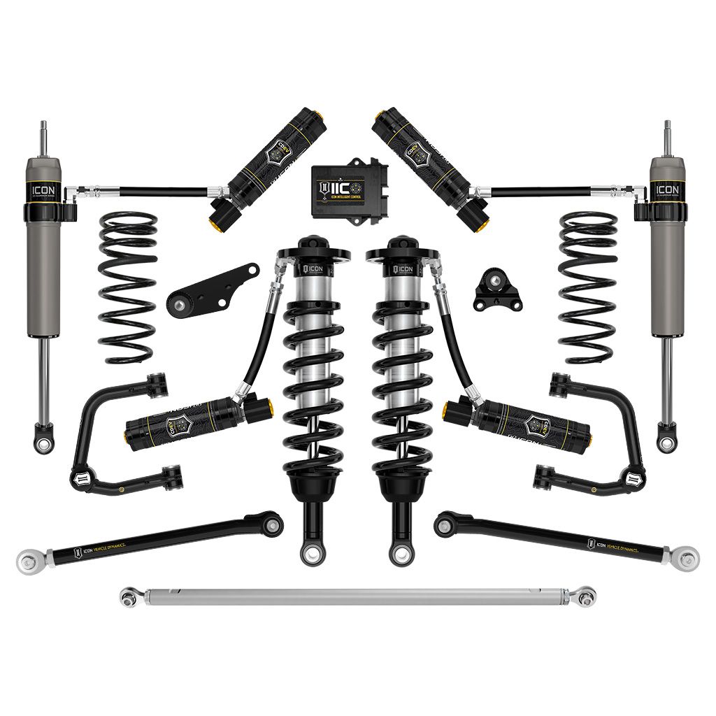 The included ICON tubular upper control arm kit is designed to improve overall performance with corrected front-end geometry, built in additional caster, and improved suspension component clearance. Additionally, replacing the OE ball joint with the all-new, serviceable, and rebuildable ICON Delta Joint PRO allows for full bump and droop travel of the front suspension while eliminating bind. The dual-rate rear coil design provides a softer ride height spring rate with a firmer overload rate that combine to deliver on-road comfort with excellent bottoming resistance and superior off-road performance while .75” of rear lift height over stock allows a for level stance front to rear. ICON tubular rear lower links employ dual-durometer greaseless bushings at one end, and massive FK rod ends at the other to provide the best combination of free articulation while isolating and damping road noise and vibrations. The ICON Billet Adjustable Rear Track Bar helps re-center the rear axle and double adjuster rod end threads allow easy "on-vehicle" fine adjustment of track bar length without requiring removal or disassembly of the track bar. ICON 2.5 Aluminum Series remote reservoir rear CDEV shocks with integrated bump zones provide improved shock damping ability and utilize a vehicle-specific valving that balances the performance of the truck from front to rear. The ICON Vehicle Dynamics 2025 Toyota 4Runner Stage 13 suspension system is an excellent choice for those drivers looking to enhance the capabilities of their pickup on the road as well as in the dirt.
