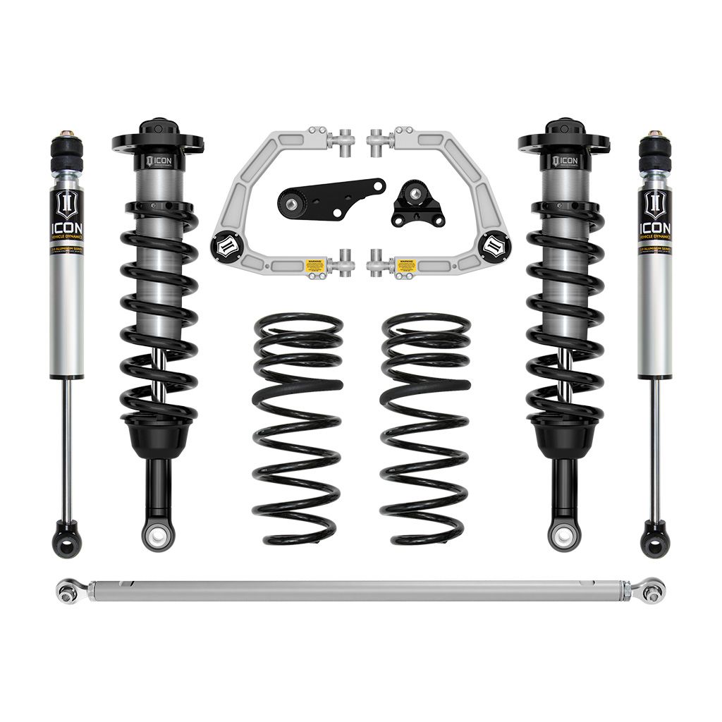 The included ICON billet aluminum upper control arm kit is designed to improve overall performance with corrected front-end geometry, increased on-vehicle camber and caster adjustment, and improved suspension component clearance. Additionally, replacing the OE ball joint with the all-new, serviceable, and rebuildable ICON Delta Joint PRO allows for full bump and droop travel of the front suspension while eliminating bind. The dual-rate rear coil design provides a softer ride height spring rate with a firmer overload rate that combine to deliver on-road comfort with excellent bottoming resistance and superior off-road performance while .75” of rear lift height over stock allows a for level stance front to rear. The ICON Billet Adjustable Rear Track Bar helps re-center the rear axle and double adjuster rod end threads allow easy "on-vehicle" fine adjustment of track bar length without requiring removal or disassembly of the track bar. ICON 2.0 Aluminum Series internal reservoir rear shocks utilize a vehicle-specific valving that balances the performance of the truck from front to rear. The ICON Vehicle Dynamics 2025 Toyota 4Runner Stage 3 suspension system is an excellent choice for those drivers looking to enhance the capabilities of their pickup on the road as well as in the dirt.