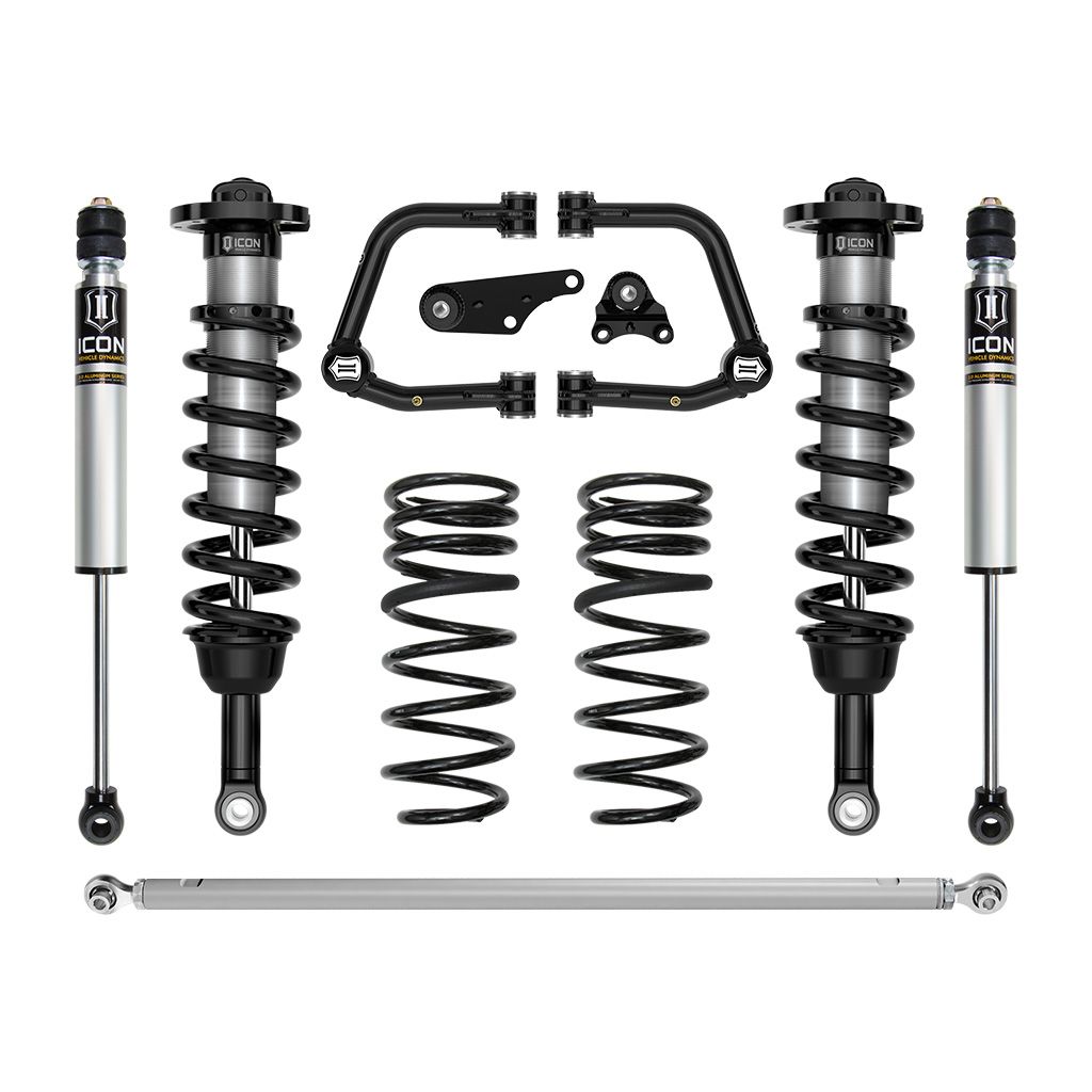 The included ICON tubular upper control arm kit is designed to improve overall performance with corrected front-end geometry, built in additional caster, and improved suspension component clearance. Additionally, replacing the OE ball joint with the all-new, serviceable, and rebuildable ICON Delta Joint PRO allows for full bump and droop travel of the front suspension while eliminating bind. The dual-rate rear coil design provides a softer ride height spring rate with a firmer overload rate that combine to deliver on-road comfort with excellent bottoming resistance and superior off-road performance while .75” of rear lift height over stock allows a for level stance front to rear. The ICON Billet Adjustable Rear Track Bar helps re-center the rear axle and double adjuster rod end threads allow easy "on-vehicle" fine adjustment of track bar length without requiring removal or disassembly of the track bar. ICON 2.0 Aluminum Series internal reservoir rear shocks utilize a vehicle-specific valving that balances the performance of the truck from front to rear. The ICON Vehicle Dynamics 2025 Toyota 4Runner Stage 3 suspension system is an excellent choice for those drivers looking to enhance the capabilities of their pickup on the road as well as in the dirt.