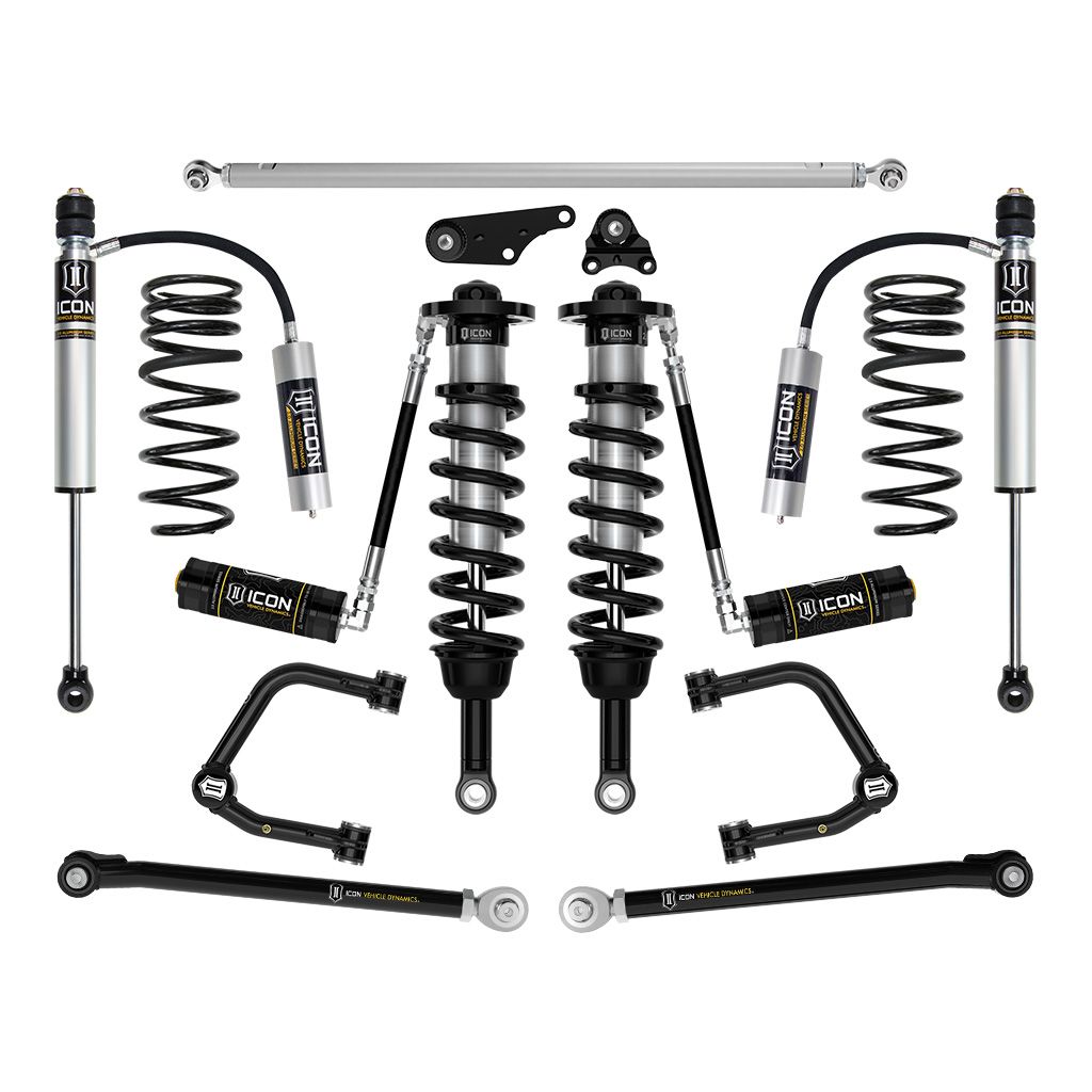 The included ICON tubular upper control arm kit is designed to improve the overall performance of the 4Runner with corrected front-end geometry, built in additional caster, and improved suspension component clearance. Additionally, replacing the OE ball joint with the all-new, serviceable, and rebuildable ICON Delta Joint PRO allows for full bump and droop travel of the front suspension while eliminating bind. The dual-rate rear coil design provides a softer ride height spring rate with a firmer overload rate that combine to deliver on-road comfort with excellent bottoming resistance and superior off-road performance while .75” of rear lift height over stock allows a for level stance front to rear. ICON tubular rear lower links employ dual-durometer greaseless bushings at one end, and massive FK rod ends at the other to provide the best combination of free articulation while isolating and damping road noise and vibrations. The ICON Billet Adjustable Rear Track Bar helps re-center the rear axle and double adjuster rod end threads allow easy "on-vehicle" fine adjustment of track bar length without requiring removal or disassembly of the track bar. ICON 2.0 Aluminum Series remote reservoir rear shocks utilize a vehicle-specific valving that balances the performance of the truck from front to rear. The ICON Vehicle Dynamics 2025 Toyota 4Runner Stage 4 suspension system is an excellent choice for those drivers looking to enhance the capabilities of their 4Runner on the road as well as in the dirt.
