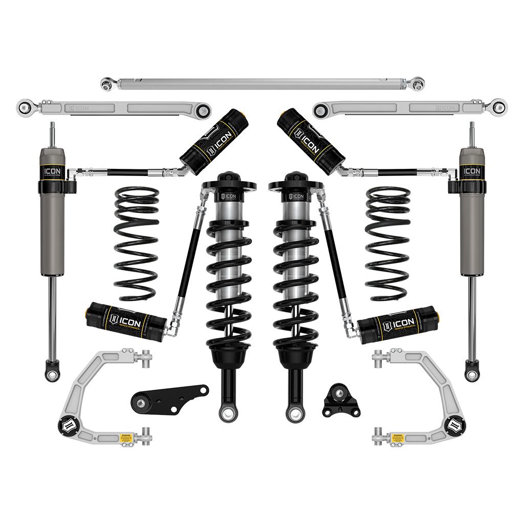 The included ICON billet aluminum upper control arm kit is designed to improve overall performance with corrected front-end geometry, increased on-vehicle camber and caster adjustment, and improved suspension component clearance. Additionally, replacing the OE ball joint with the all-new, serviceable, and rebuildable ICON Delta Joint PRO allows for full bump and droop travel of the front suspension while eliminating bind. The dual-rate rear coil design provides a softer ride height spring rate with a firmer overload rate that combine to deliver on-road comfort with excellent bottoming resistance and superior off-road performance while .75” of rear lift height over stock allows a for level stance front to rear. ICON billet rear lower links feature on-vehicle adjustability via the ICON double adjuster and employ dual-durometer greaseless bushings at one end, and massive FK rod ends at the other to provide the best combination of free articulation while isolating and damping road noise and vibrations. The ICON Billet Adjustable Rear Track Bar helps re-center the rear axle and double adjuster rod end threads allow easy "on-vehicle" fine adjustment of track bar length without requiring removal or disassembly of the track bar. ICON 2.5 Aluminum Series remote reservoir rear shocks with integrated bump zones provide improved shock damping ability and utilize a vehicle-specific valving that balances the performance of the truck from front to rear. The ICON Vehicle Dynamics 2025 Toyota 4Runner Stage 7 suspension system is an excellent choice for those drivers looking to enhance the capabilities of their pickup on the road as well as in the dirt.