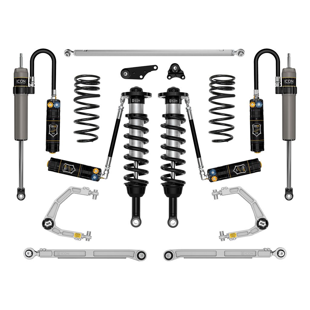 The included ICON billet aluminum upper control arm kit is designed to improve overall performance with corrected front-end geometry, increased on-vehicle camber and caster adjustment, and improved suspension component clearance. Additionally, replacing the OE ball joint with the all-new, serviceable, and rebuildable ICON Delta Joint PRO allows for full bump and droop travel of the front suspension while eliminating bind. The dual-rate rear coil design provides a softer ride height spring rate with a firmer overload rate that combine to deliver on-road comfort with excellent bottoming resistance and superior off-road performance while .75” of rear lift height over stock allows a for level stance front to rear. ICON billet rear lower links feature on-vehicle adjustability via the ICON double adjuster and employ dual-durometer greaseless bushings at one end, and massive FK rod ends at the other to provide the best combination of free articulation while isolating and damping road noise and vibrations. The ICON Billet Adjustable Rear Track Bar helps re-center the rear axle and double adjuster rod end threads allow easy "on-vehicle" fine adjustment of track bar length without requiring removal or disassembly of the track bar. ICON 2.5 Aluminum Series remote reservoir CDXS rear shocks with integrated bump zones provide improved shock damping ability and utilize a vehicle-specific valving that balances the performance of the truck from front to rear. The ICON Vehicle Dynamics 2025 Toyota 4Runner Stage 9 suspension system is an excellent choice for those drivers looking to enhance the capabilities of their pickup on the road as well as in the dirt.