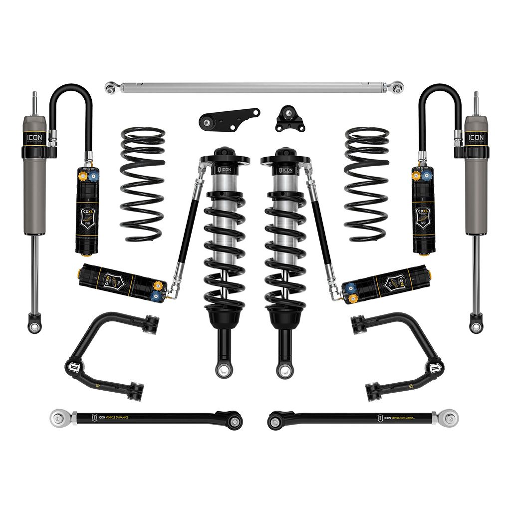 The included ICON tubular upper control arm kit is designed to improve overall performance with corrected front-end geometry, built in additional caster, and improved suspension component clearance. Additionally, replacing the OE ball joint with the all-new, serviceable, and rebuildable ICON Delta Joint PRO allows for full bump and droop travel of the front suspension while eliminating bind. The dual-rate rear coil design provides a softer ride height spring rate with a firmer overload rate that combine to deliver on-road comfort with excellent bottoming resistance and superior off-road performance while .75” of rear lift height over stock allows a for level stance front to rear. ICON tubular rear lower links employ dual-durometer greaseless bushings at one end, and massive FK rod ends at the other to provide the best combination of free articulation while isolating and damping road noise and vibrations. The ICON Billet Adjustable Rear Track Bar helps re-center the rear axle and double adjuster rod end threads allow easy "on-vehicle" fine adjustment of track bar length without requiring removal or disassembly of the track bar. ICON 2.5 Aluminum Series remote reservoir CDCV rear shocks with integrated bump zones provide improved shock damping ability and utilize a vehicle-specific valving that balances the performance of the truck from front to rear. The ICON Vehicle Dynamics 2025 Toyota 4Runner Stage 9 suspension system is an excellent choice for those drivers looking to enhance the capabilities of their pickup on the road as well as in the dirt.