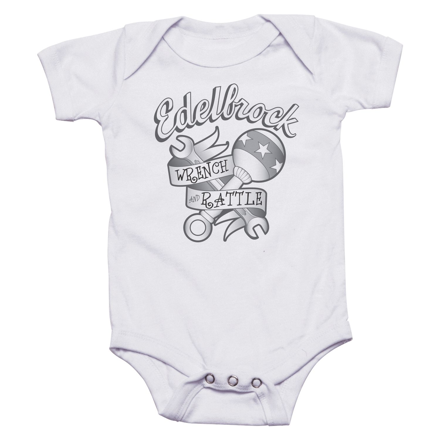 The Edelbrock WRENCH & RATTLE Infant One Piece is a 100% cotton jersey onesie. The onesie features custom graphics on the front of the garment. This piece has lap shoulder construction with a 3 snap bottom closure and is pre-shrunk to minimize shrinkage.