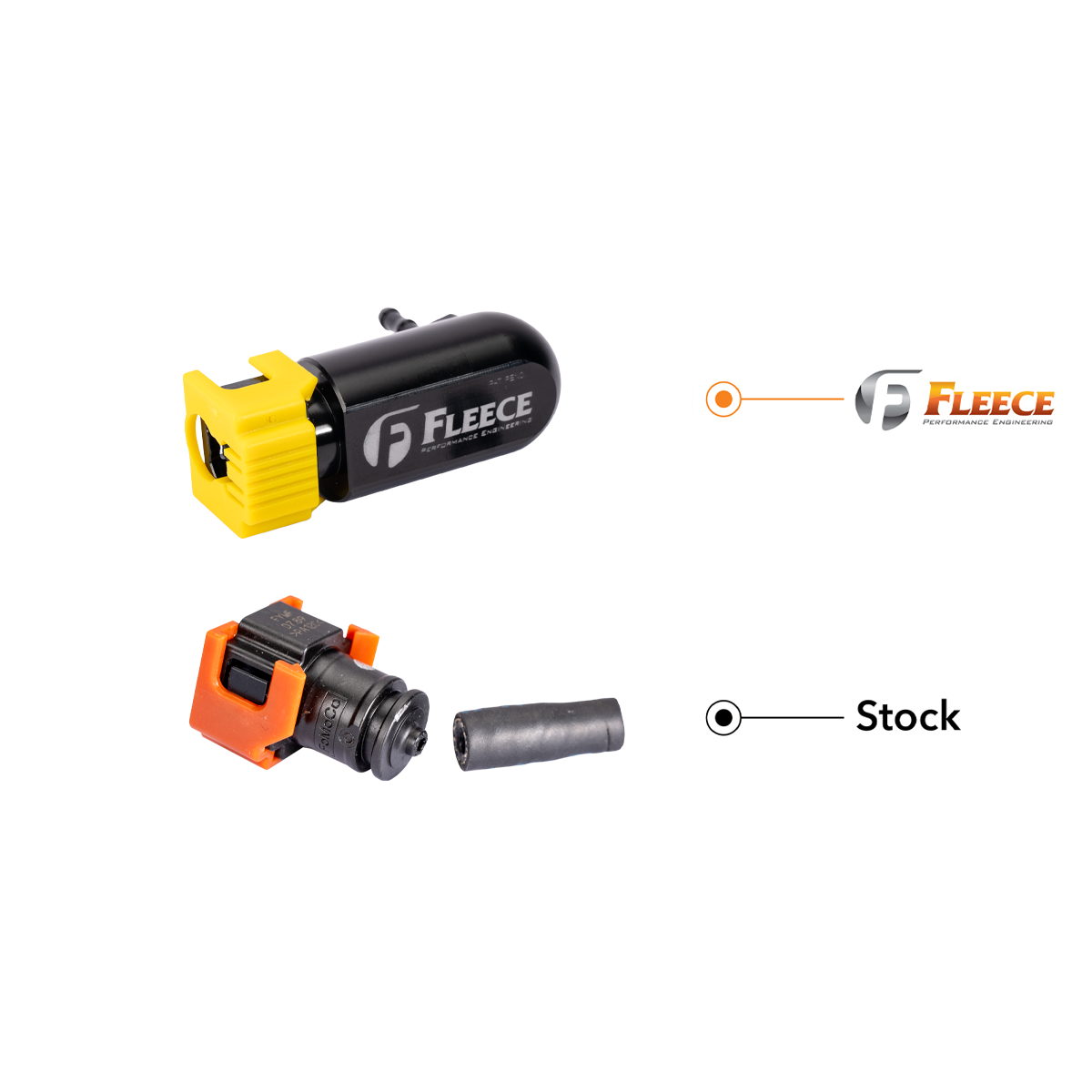 The plastic factory injector return connector on the 2017-2024 6.7L Power Stroke is susceptible to breakage from heat, vibration, rough handling and frequent disconnections for fuel filter maintenance. Upgrade your injector return fitting and eliminate the risk of a broken fuel line with our heavy duty billet aluminum injector return fitting. Featuring a dual O-ring internal design and serviceable barb fitting the Fleece Performance injector return fitting will ensure you're not left stranded with a broken, non-repairable fuel line. Our 5-pack kit for fleets and servicing outlets also includes our fitting service kit (FPE-FMC-FF-RLK-1724-SER) to perform a quick repair if necessary during filter maintenance. Kit includes: Quantity 5 – FPE-FMC-FF-RLK-1724 Quantity 1 – FPE-FMC-FF-RLK-1724-SER Features Heavy duty, machined billet aluminum housing. Dual O-ring internal design for increased sealing. Serviceable billet aluminum barb fitting. Easy to install and remove during filter maintenance Application Notes This kit is designed to work with both OEM and aftermarket under hood fuel filter assemblies including Fleece Performance P/N: FPE-FMC-UHFA-1123. A service kit is available for this product, Fleece Performance P/N: FPE-FMC-FF-RLK-1724-SER. The kit includes replacement O-rings and locking tabs. A replacement barb fitting is available for this product, Fleece Performance P/N: FPE-AN4-332B.
