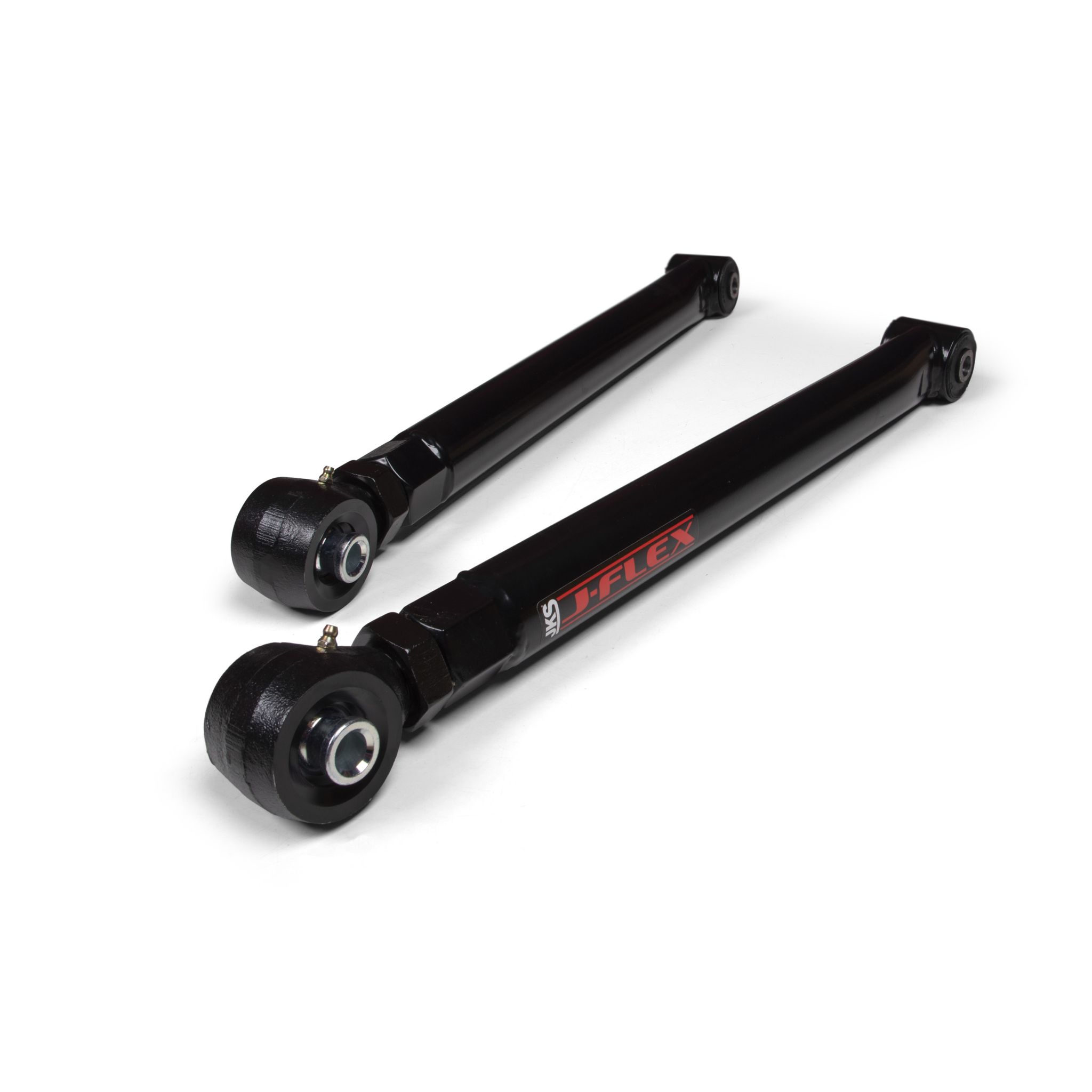 Build up your Jeep Gladiator JT the right way with these high strength J-Flex rear adjustable lower control arms from JKS. Built for superior strength and smooth operation on/offroad, these arms allow you to correctly position the rear axle and correct pinion angle on your stock or lifted Gladiator. J-Flex arms are built from heavy duty 2” OD x .250-wall DOM tubing for a massive improvement to factory arms that won't let you down out on the trail. At the axle mount, J-Flex arms feature premium OE style rubber bushings to absorb noise and reduce vibrations for a comfortable, quiet ride and maintenance-free operation. At the frame-side mount, J-Flex arms incorporate a unique hex-shaped threaded bung for easy adjustment of the forged flex end and 1-1/4”-12 threads jam nut Flex end design allows for 30-degrees of misalignment (15 in either direction) for impressive articulation and are greaseable to ensure long bushing life. When the time comes, JKS flex ends are rebuildable. As with all JKS control arms, these J-Flex lower control arms come finished in a durable gloss black powder coat finish and are backed by JKS’s limited lifetime warranty. Sold in pairs.