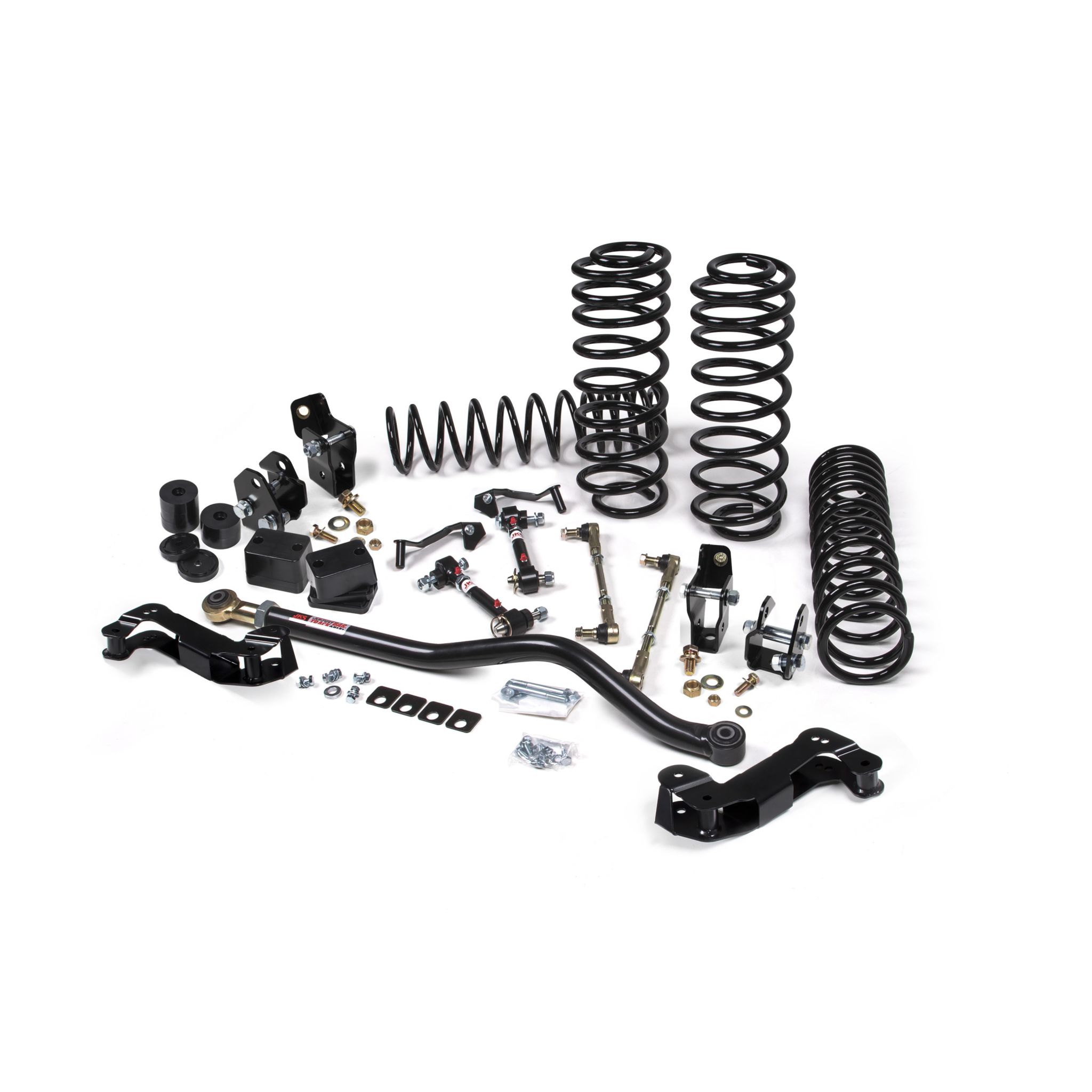 Increase the clearance and performance of your 4-Door Jeep Wrangler JL with a 2.5" lift J-Kontrol™ suspension system. It delivers exceptional stability on and off road. A step up from JKS J-Venture™ systems, J-Kontrol™ is a true bolt-on system that adds in front control arm correction brackets to the J-Venture Kit's long list of upgrade components including JSPEC dual-rate coil springs, a front adjustable Track Bar and rear Track Bar Bracket (to correct axle positioning under vehicle), Quicker-Disconnect sway bar end links, front/rear Bump Stop Extensions and front Control Arm Correction Brackets to flatten upper/lower control arm angles. The supplied control arm brackets work with your Jeep's stock control arms to correct caster and improve handling. J-Kontrol offers enhanced performance for daily driving, beach cruising, or regular trail use.