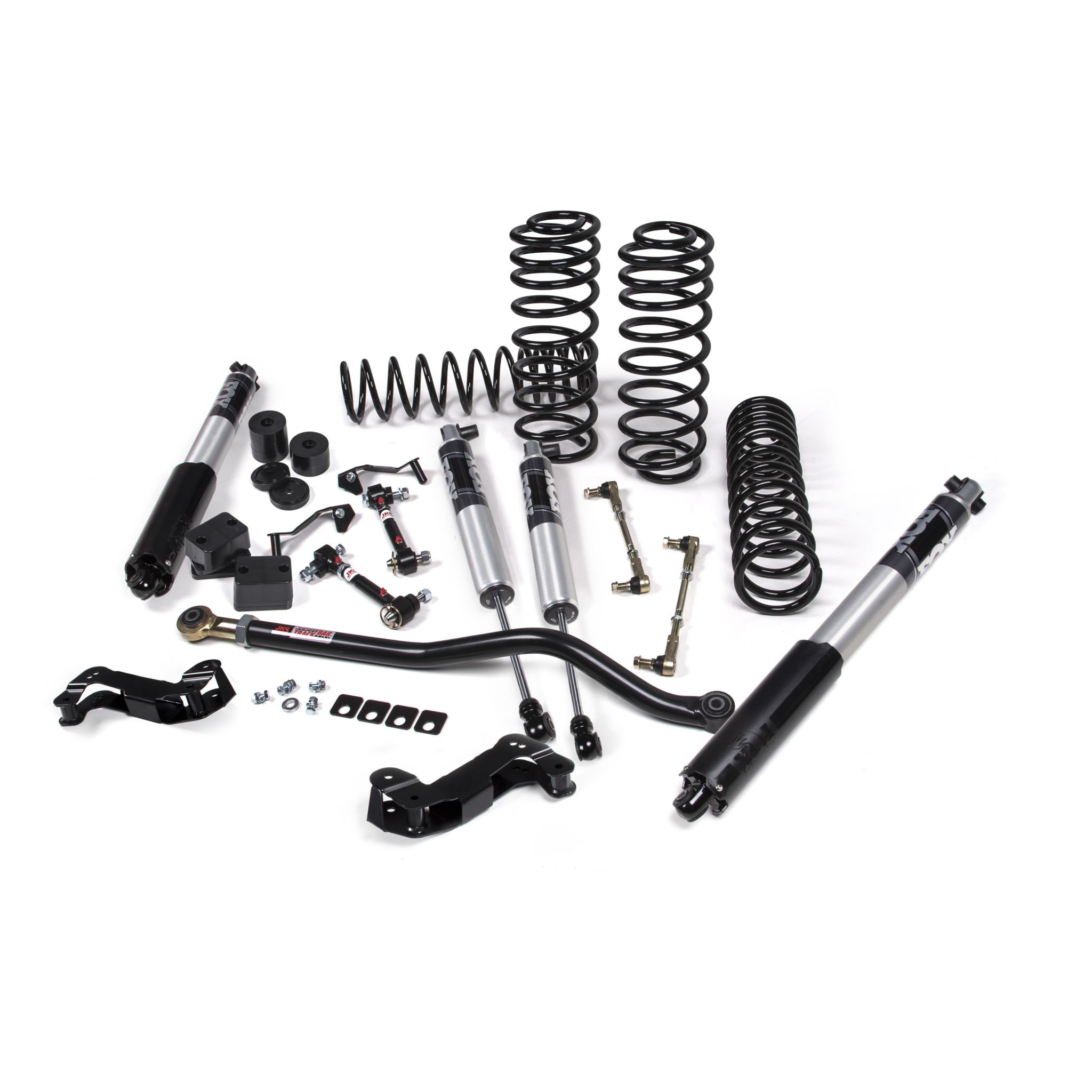 Increase the clearance and performance of your Jeep Wrangler JL with a 2.5" J-Kontrol™ suspension lift system. It delivers exceptional stability on and off road. A step up from JKS J-Venture™ systems, J-Kontrol™ is a true bolt-on system that adds in front control arm correction brackets to flatten upper/lower control arm angles, plus a long list of upgraded components including JSPEC dual-rate coil springs, your selection of Jspec or Fox shocks, an adjustable front track bar and rear track bar bracket to correct axle positioning under vehicle, Quicker-Disconnect sway bar end links and front/rear Bump Stop Extensions. The supplied control arm brackets work with your Jeep's stock control arms to correct caster and improve handling. J-Kontrol offers enhanced performance for daily driving, beach cruising, or regular trail use. Now available with the new Fox 2.5 Performance Series shocks! The 2.5" aluminum bodies with a race-developed main piston and true internal floating piston (IFP) separate gas and oil to provide consistent and fade-resistant performance. The 2.5-inch piston offers a greater force capability by moving more fluid and increasing damping and is less prone to cavitation.