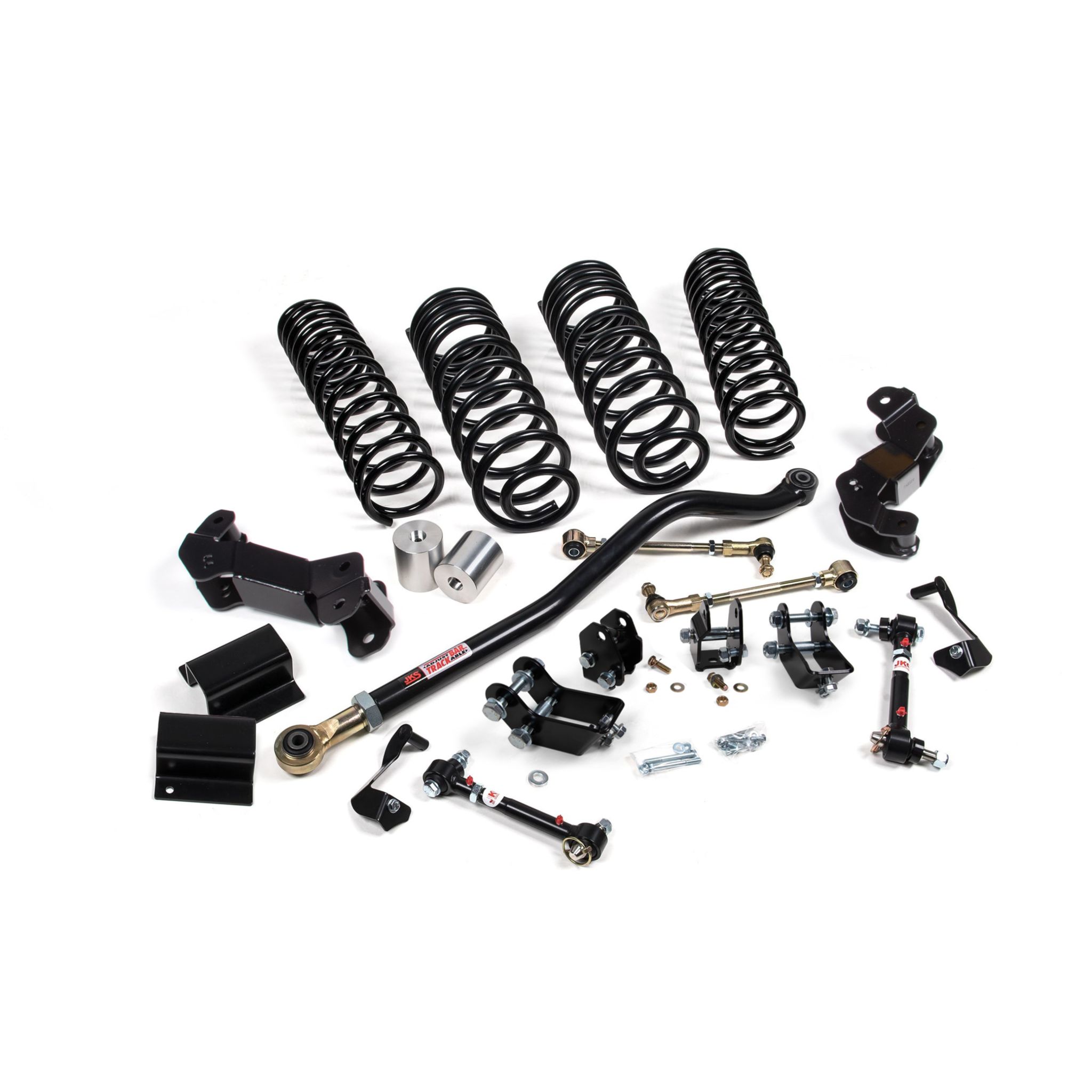 Increase the ground clearance and performance of your Jeep JT Gladiator with a J-Kontrol™ suspension lift system. Building on the J-Venture series, this is a true bolt-on system that adds in front control arm correction brackets to flatten upper/lower control arm angles, plus a long list of upgraded components including JSPEC dual-rate coil springs, your selection of Jspec or Fox shocks, an adjustable front track bar and rear track bar bracket to correct axle positioning under vehicle, Quicker-Disconnect sway bar end links and front/rear Bump Stop Extensions. The supplied control arm brackets work with your Jeep's stock control arms to correct caster and improve handling. J-Kontrol offers enhanced performance for daily driving, beach cruising, or regular trail use.