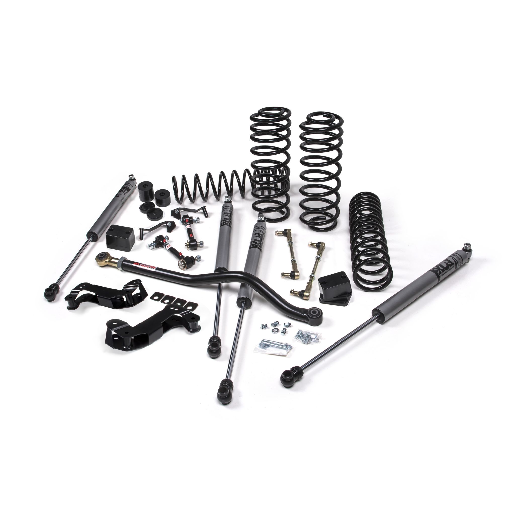 Improve the ground clearance and off road capability of your 2 Door Jeep Wrangler JL with the JKS J-Kontrol 3.5" suspension system. The J-Kontrol system retains your OE control arms, but steps up the rest of your suspension. J-Kontrol kits feature dual rate coil springs, adjustable front track bar, specially-valved gas shocks, sway bar Quicker Disconnects, and front control arm correction brackets as well as all other necessary hardware for a complete bolt-on installation. J-Kontrol system's front control arm correction brackets further enhance the on-road handling by flattening out the control arm to more closely mimic factory angles while correcting caster. With a matched combination of parts, J-Kontrol systems offer very solid performance without compromising daily-driver comfort. If you spend a good amount of time on the trails, take control with J-Kontrol.
