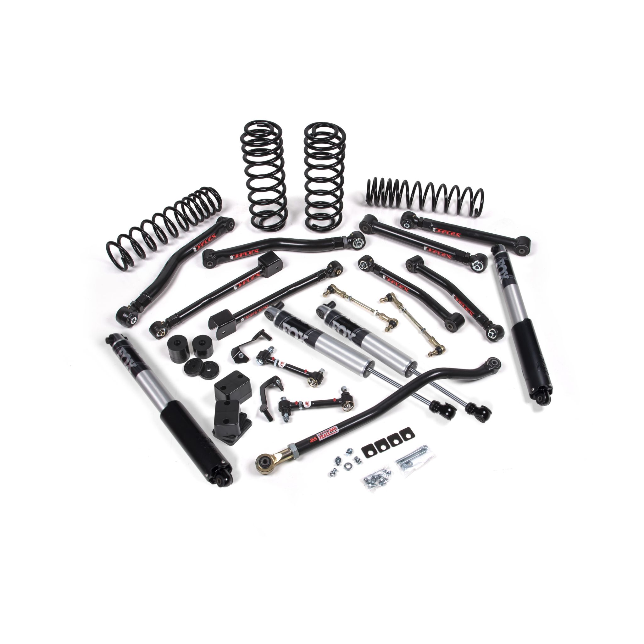 Turn your 4 Door Jeep Wrangler JL into a serious off road rig with a JKS J-Krawl 2.5" lift kit. Designed for maximum articulation and adjustability, the complete suspension system includes dual rate coil springs, adjustable front track bar, rear track bar bracket and tuned FOX shocks. The heart of the J-Krawl design is a set of J-Flex upper and lower control arms and sway bar Quicker disconnects. These systems build off Jeep’s factory suspension mounting points and upgrades to front and rear, upper and lower J-Flex adjustable control arms for maximum articulation along with more strength for trails and rock crawling brawn along with adjustability to dial in front caster, rear pinion and overall vehicle wheelbase. In addition to eight high strength adjustable control arms, the J-Krawl system features your choice of Fox shocks to maximize travel and performance. An aftermarket front driveshaft is strongly recommended due to additional travel capable. Routine maintenance is required. Now available with the new Fox 2.5 Performance Series shocks! The 2.5" aluminum bodies with a race-developed main piston and true internal floating piston (IFP) separate gas and oil to provide consistent and fade-resistant performance. The 2.5-inch piston offers a greater force capability by moving more fluid and increasing damping and is less prone to cavitation.
