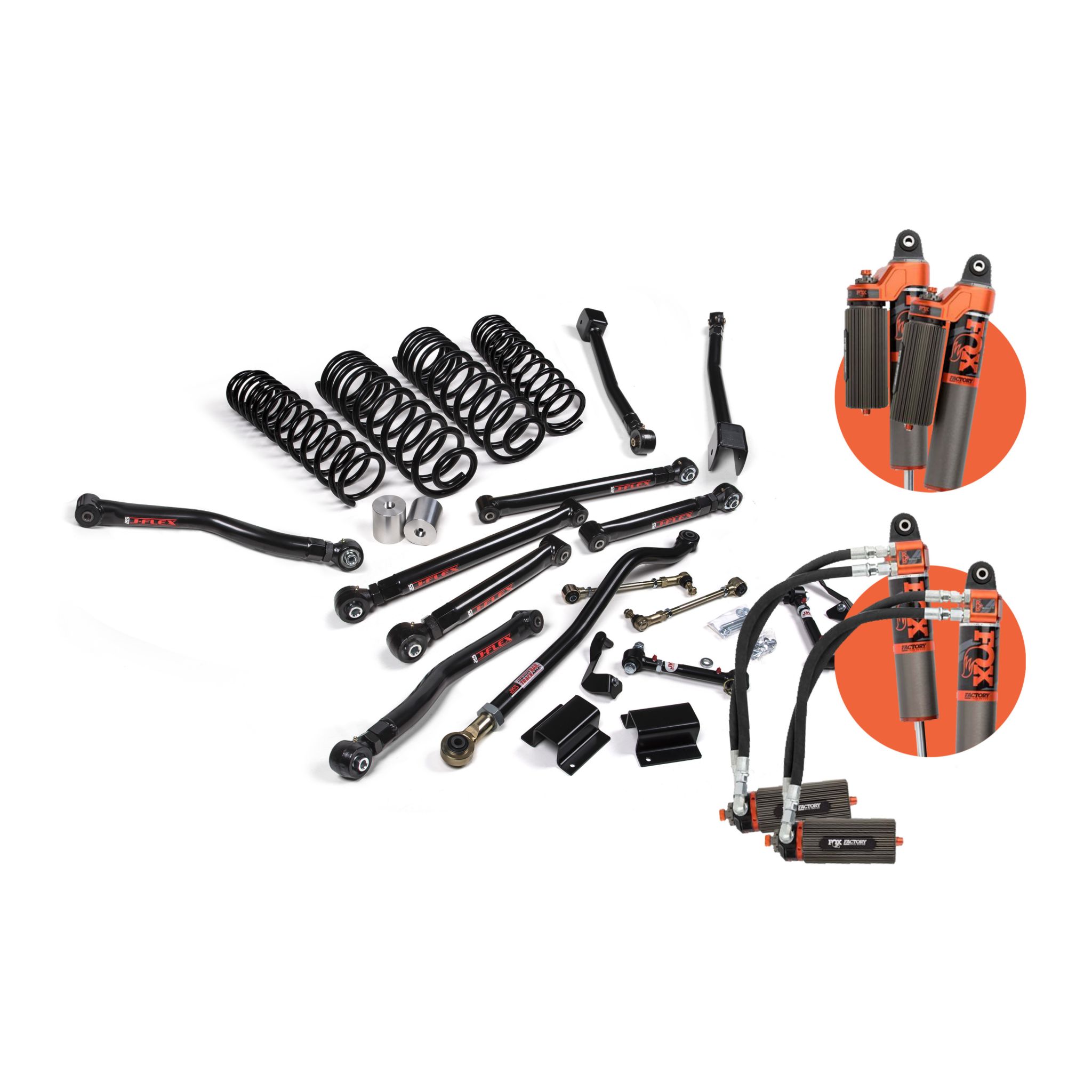 From hardcore rock crawling to go fast desert, J-Krawl has everything you need to set your Gladiator up right at the 3.5" lift height. The complete system is designed for maximum articulation, strength and adjustability. Components include J-Flex upper and lower control arms, Jspec dual rate coil springs at each corner designed to level out the stance, and custom-valved FOX 2.0, FOX 2.5, or FOX 3.0 monotube shocks all the way around to match your performance needs. Also included is an adjustable front track bar, quicker disconnect front sway bar end links, rear sway bar links, and bump stop extensions. J-Krawl builds off Jeep’s factory suspension mounting points and upgrades everything front to rear. Adjustability is important for fine tuning suspension geometry. J-Krawl delivers. Dial in front caster, rear pinion and overall vehicle wheelbase. The JKS Engineering team spent a lot of time dialing in the FOX shock valving and spring rates to suit J-Krawl's combination of parts as well as oversized wheels and tires. You'll be impressed with the stability and compression/rebound response. Take your Jeep's off-road performance and strength to the next level. It should be noted that an aftermarket front driveshaft is strongly recommended due to potential additional travel.