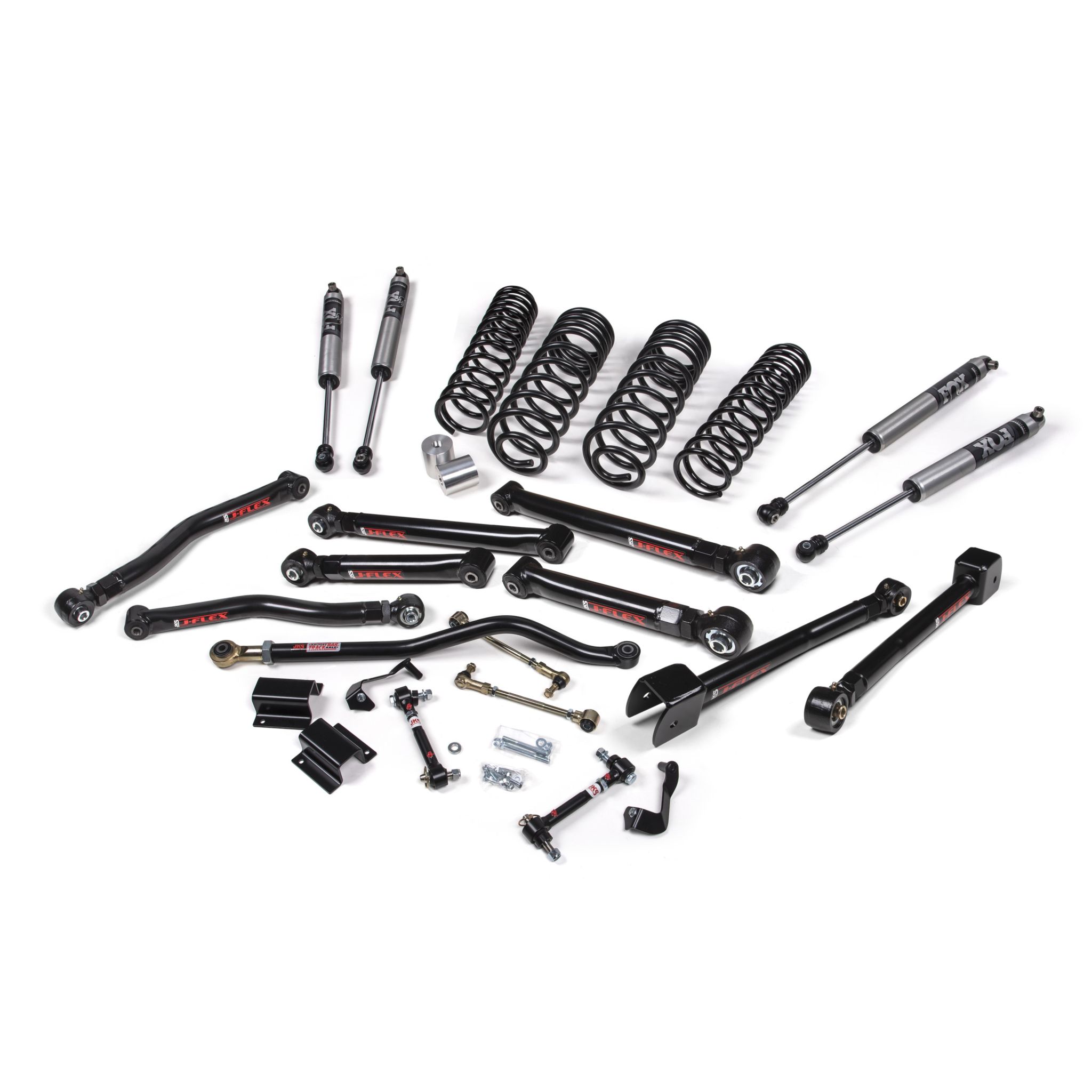 From hardcore rock crawling to go fast desert, J-Krawl has everything you need to set your Gladiator up right at the 3.5" lift height. The complete system is designed for maximum articulation, strength and adjustability. Components include J-Flex upper and lower control arms, Jspec dual rate coil springs at each corner designed to level out the stance, and custom-valved FOX 2.0, FOX 2.5, or FOX 3.0 monotube shocks all the way around to match your performance needs. Also included is an adjustable front track bar, quicker disconnect front sway bar end links, rear sway bar links, and bump stop extensions. J-Krawl builds off Jeep’s factory suspension mounting points and upgrades everything front to rear. Adjustability is important for fine tuning suspension geometry. J-Krawl delivers. Dial in front caster, rear pinion and overall vehicle wheelbase. The JKS Engineering team spent a lot of time dialing in the FOX shock valving and spring rates to suit J-Krawl's combination of parts as well as oversized wheels and tires. You'll be impressed with the stability and compression/rebound response. Take your Jeep's off-road performance and strength to the next level. It should be noted that an aftermarket front driveshaft is strongly recommended due to potential additional travel.