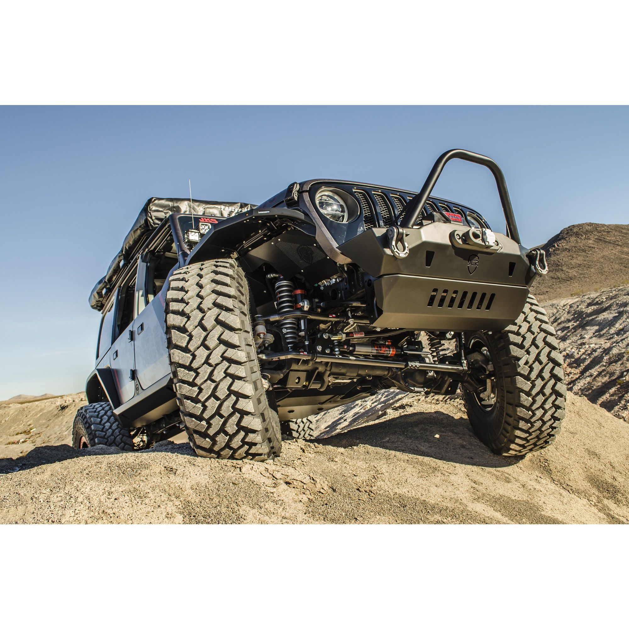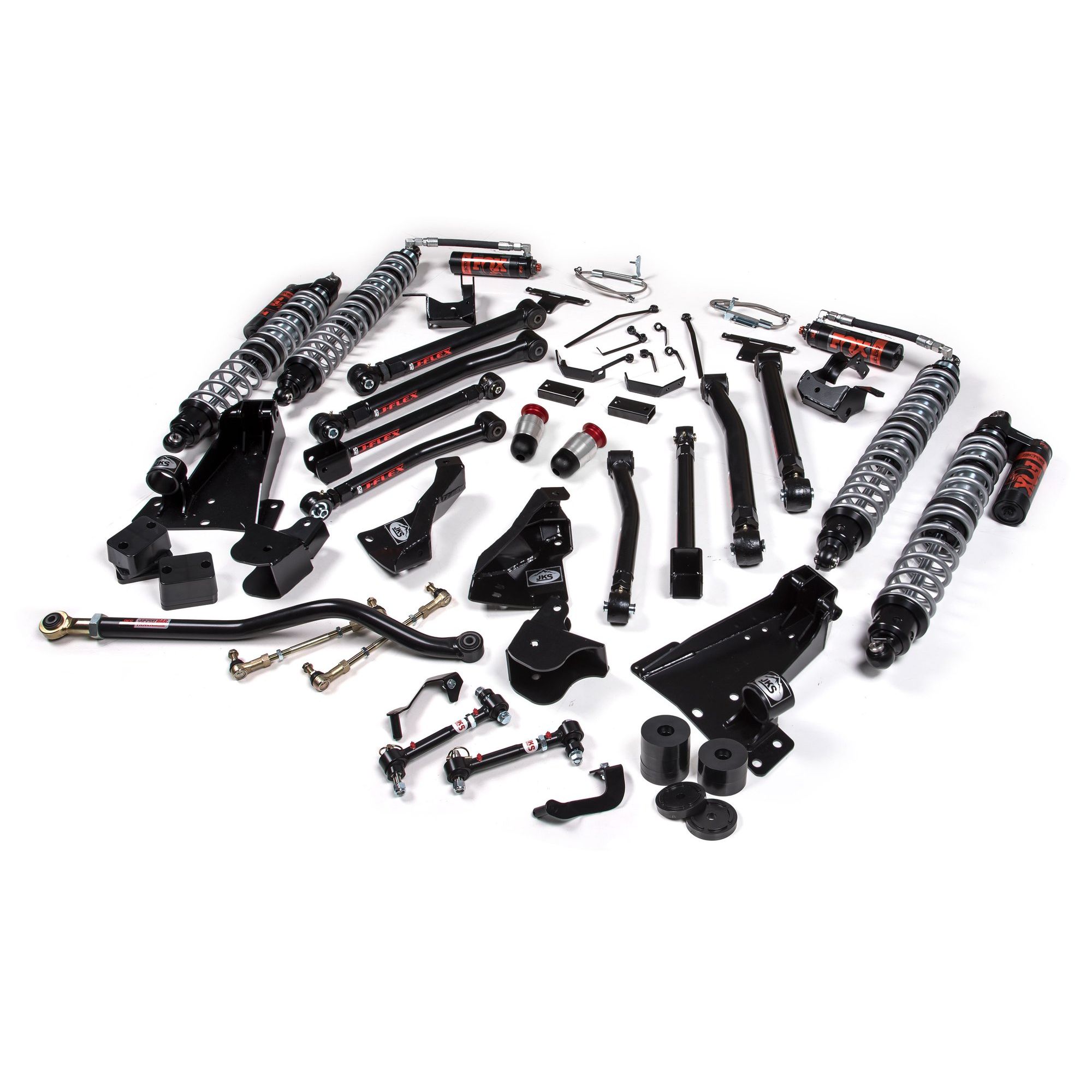 J-Max pulls out all of the stops to offer a truly performance driven suspension package. At each corner are custom tuned FOX 2.5 factory race series coilovers with DSC adjustment. These coilovers offer race proven technology with a larger 2.5” diameter body, dual rate springs and (DSC) dual speed compression adjustment for maximum tunability. Each of the 8 control arms, upper and lowers, front and rear are upgraded to J-Flex adjustable control arm for improved strength, offroad performance and adjustability. In addition, these kits feature high strength bolt-on coilover mounting brackets, an adjustable front track bar, sway bar quicker disconnects and more offer take your Jeeps trail performance and strength to the next level. It should be noted that an aftermarket front driveshaft is strongly recommended due to additional travel capable.