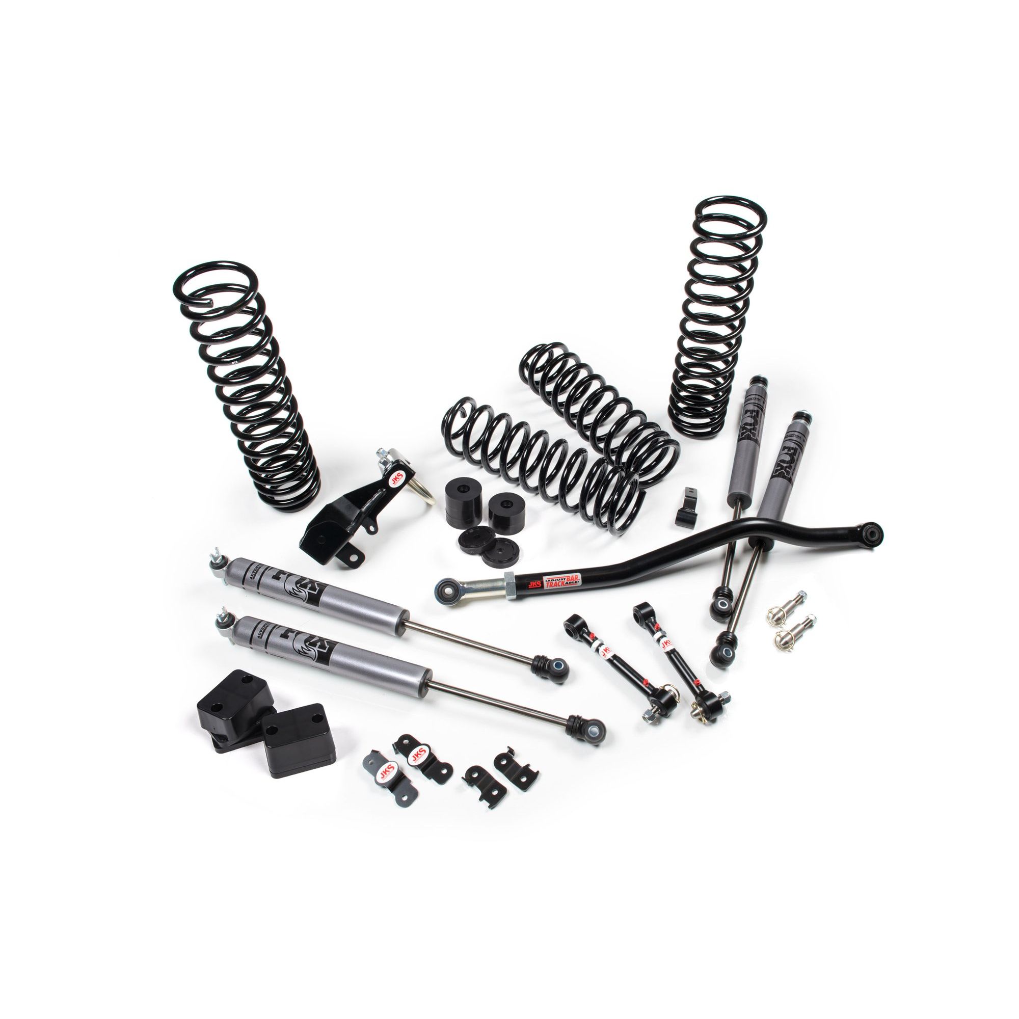 Increase your Jeep Wrangler JK 4-Door's ground clearance, tire clearance and performance with a J-Venture 2.5" lift suspension system. This complete, bolt-on kit includes custom-matched JSPEC dual-rate coil springs, custom-valved FOX Adventure Series monotube gas shocks, a front adjustable track bar, rear track bar bracket, front sway bar Quicker Disconnects, bump stop extensions, and caster plate alignment correction. J-Venture™ provides improved ride quality on road. When the road ends, disconnect your sway bar end links for improved articulation. That makes J-Venture the perfect entry-level performance suspension system. FOX Adventure Series shocks enhance performance as compared to standard JSPEC shock absorbers. The system has been engineered for low maintenance. Get out and explore with J-Venture.