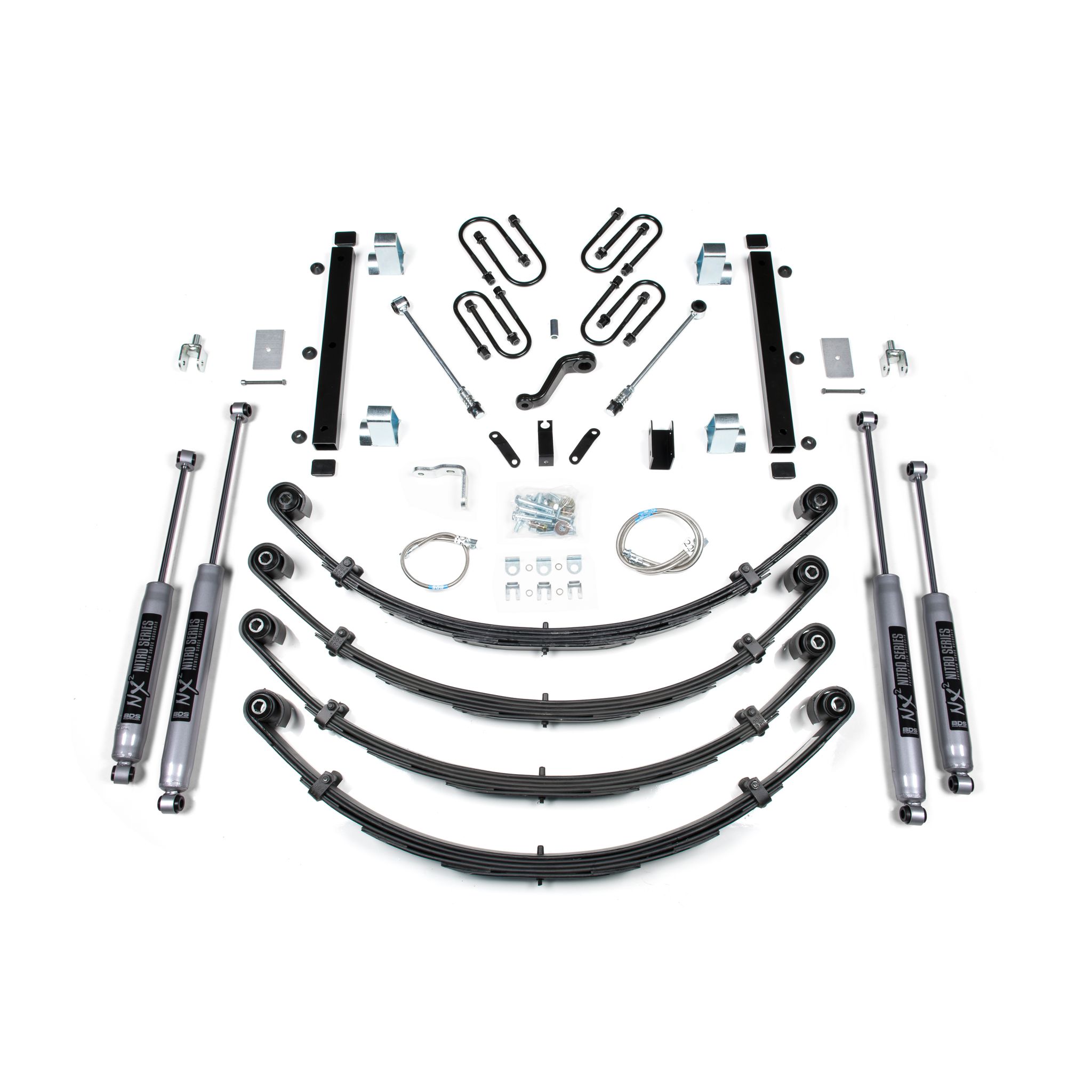<p>This 5-inch lift kit includes front and rear Glide-Ride leaf springs with new u-bolts, front and rear track bar relocation brackets to center the axle, stainless steel braided brake lines, sway bar disconnects, power steering pitman arm, bump stop extensions, and a transfer case drop kit to ease the drive line angles. Round out this kit with specially tuned NX2 nitro series gas shocks to offer improved damper performance.</p>