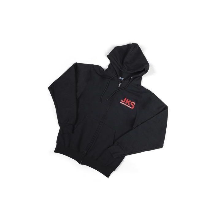 Stay warm in your JKS equipped Jeep wearing a JKS Hoodie. These 50/50 cotton/polyester zip up hooded sweatshirts feature DryBlend technology for comfort and performance. We have hoodies available in black with the traditional red and white JKS Manufacturing logo up front and the JKS mountain logo on the back these stylish hoodies look great and keep you warm on the trail, in the shop or just to wear day-to-day. Available in sizes from Small to 3XL.