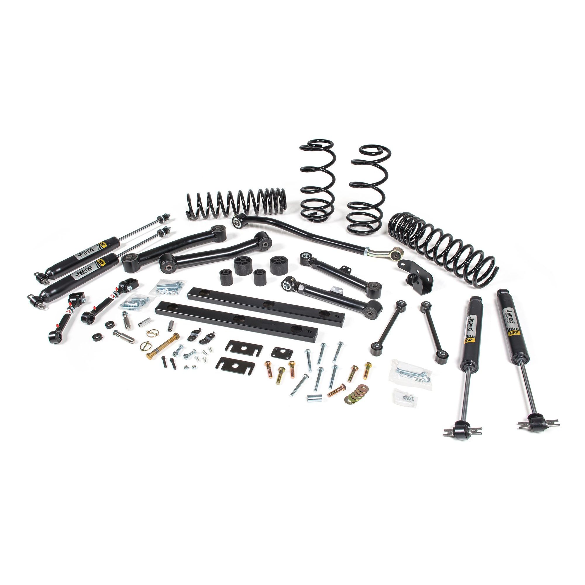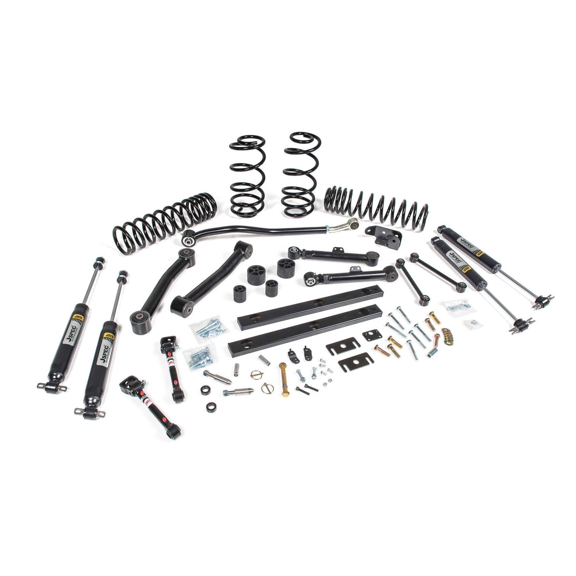 Improve the ride and fit larger tires on your Jeep Wrangler TJ or LJ by installing the JKS 3" suspension system. In addition to the added clearance, you'll be thoroughly impressed with the ride quality and handling improvements. The JKS 3" lift kit includes custom tuned JSPEC dual rate coil springs, sway bar Quicker disconnects, front adjustable track bar, bump stop extensions, J-Link front lower control arms, J-Flex rear upper control arms, heavy duty rear track bar bracket, rear sway bar links, and a set of custom-valved JSPEC gas shocks. Now TJ owners can enjoy the benefits of a complete JSPEC suspension system outfitted with the most popular JKS suspension components. This is the most the best riding 3” lift kit available on the market today. Why buy mismatched parts when you can have complete, custom matched JKS suspension system? <a href=" http://www.drivingline.com/articles/jks-jspec-3-inch-suspension-review/" target="_blank">Check out the Install Article by Driving Line</a>