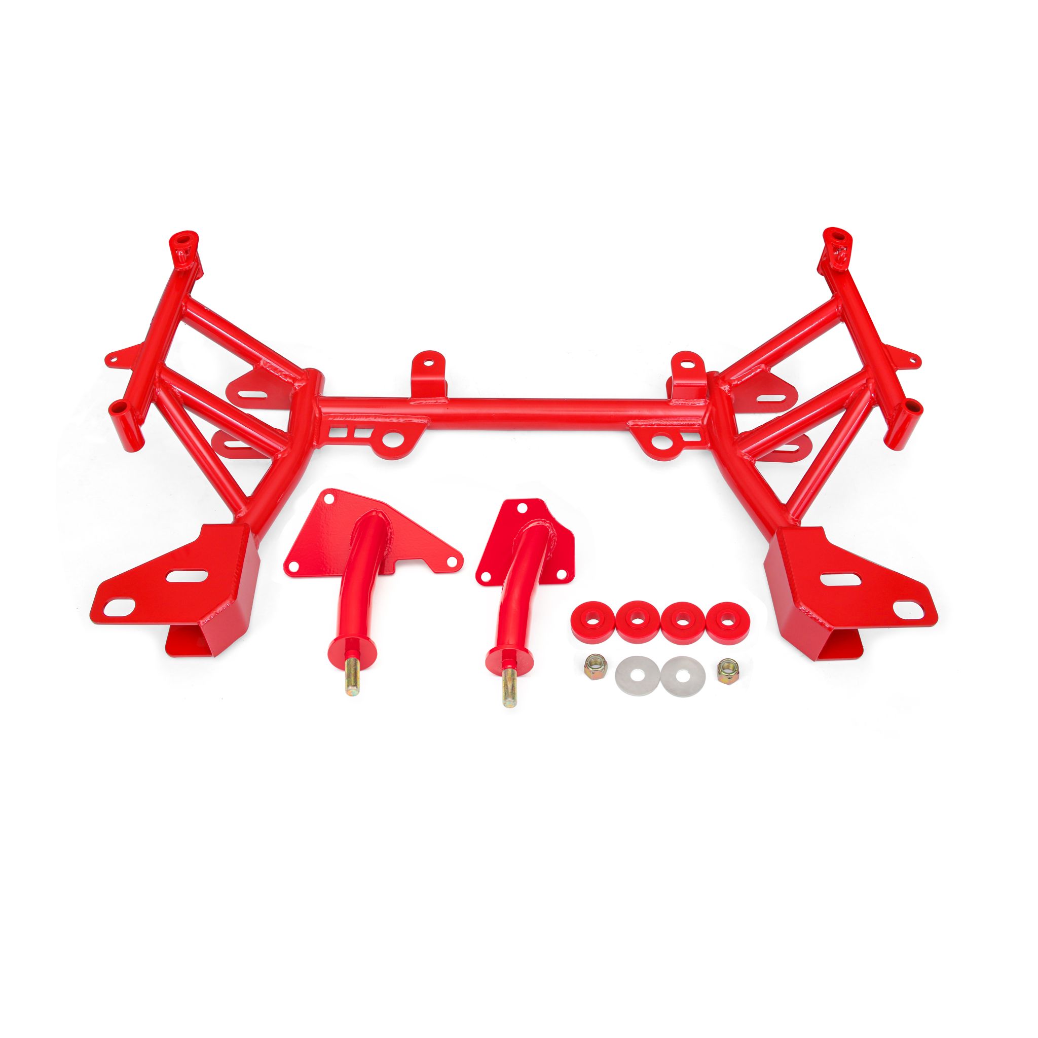 Reduce weight, increase frontend rigidity, and add clearance for large-tube headers and turbo kits with a Tubular K-members from BMR Suspension. BMR Tubular K-Members are designed to provide a lightweight alternative to the heavy and bulky factory K-member. Manufactured from 1-5/8-inch x 0.120 wall and 1-1/4-inch x 0.095 wall DOM tubing, BMRs K-members give you a lightweight, extremely strong K-member. Every BMR K-member is 100-percent bolt-in and requires no modifications for fitment. This K-member is built with provision for a factory steering rack. Designed for street performance, drag race, and road race applications, BMR Tubular K-members drop weight and add loads of structural rigidity. BMRs unique K-member design features integrated frame stands that replace the factory cast iron frame stands. This additional weight reduction allows us to use larger diameter tubing and thicker mounting plates for additional strength over other companies K-members. When combined with BMRs upper and lower A-arms, a minimum weight reduction of 42 pounds is common. With other lightweight frontend parts, weight reduction of up to 100 pounds is easily achievable. BMR Suspensions KM341 Tubular K-Member is available in black hammertone and red powdercoat for long-lasting good looks. Installation time is about 4-5 hours. Proudly made in the U.S.A.!