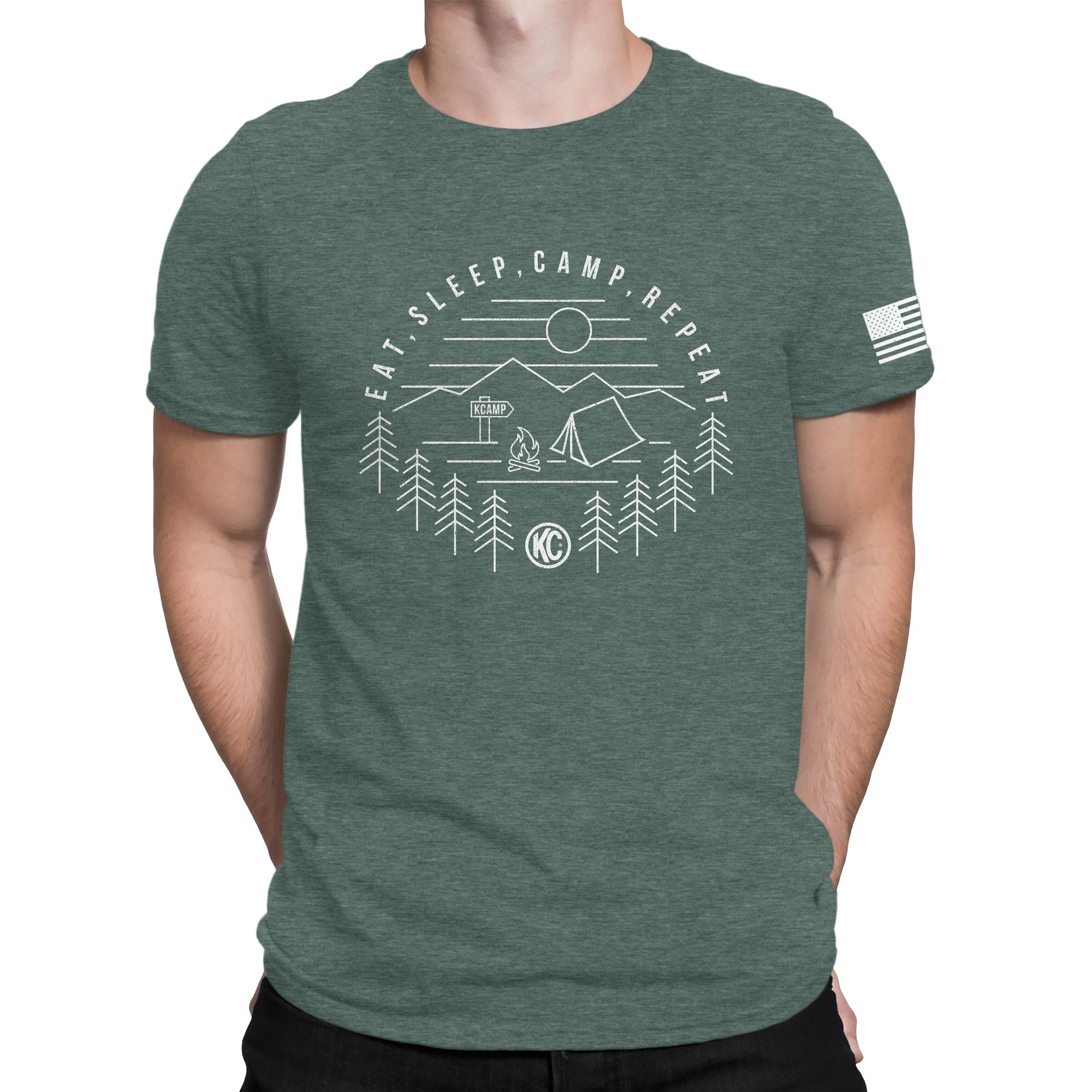 This pine green t-shirt embodies the KC spirit of adventure. Front print reads Eat, Sleep, Camp, Repeat, with a US Flag on the left arm sleeve, and a small KC logo on the back neckline. Made from 65/35 polyester/combed ringspun cotton.