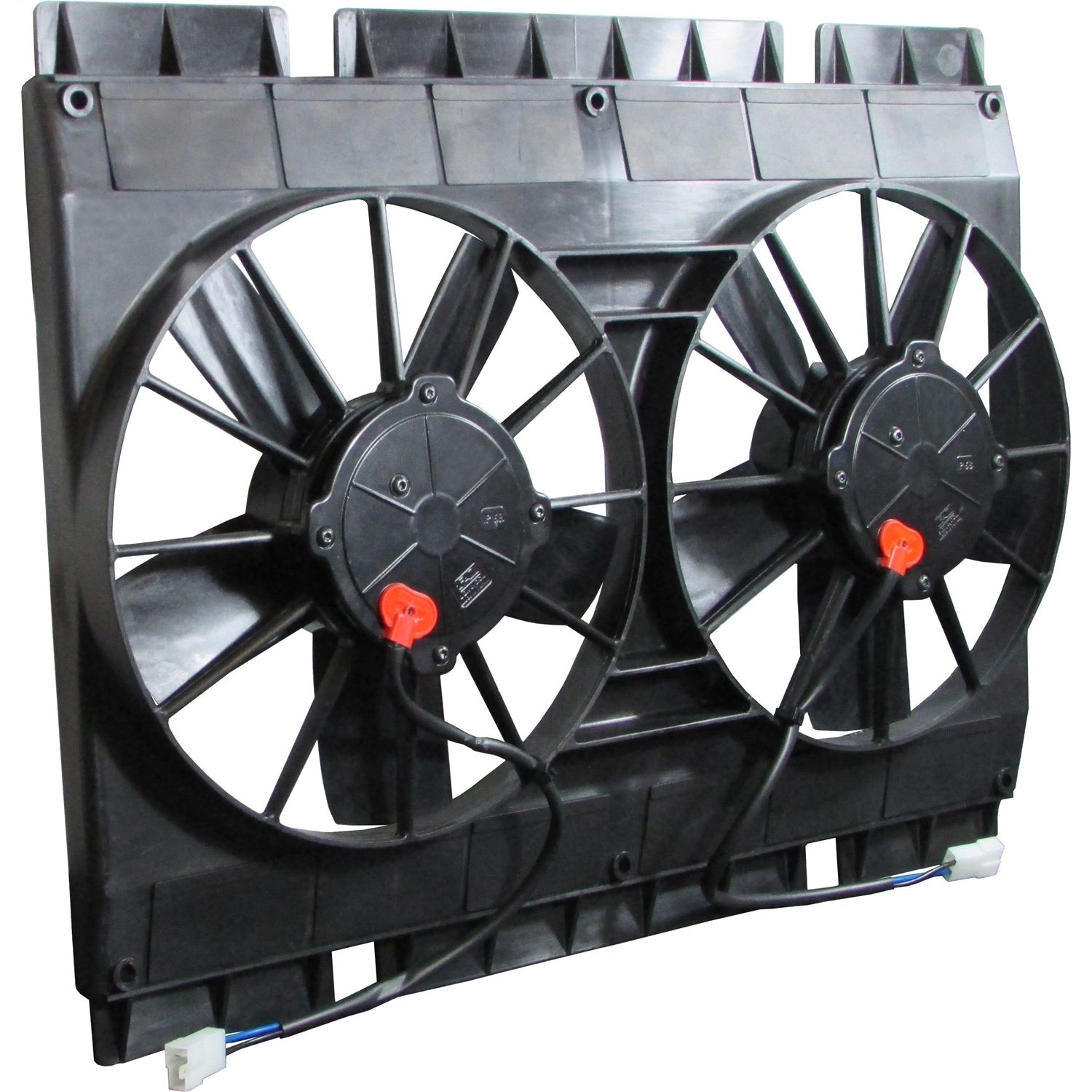 Mach Two Series Fan made of glass-filled nylon construction with dual 225 high performance drip through motors is available in three models. This fan fits most GM cross-flow radiators with a minimum size of 23.5 in. x 15.75 in.. Recommended wire harness is sold separately.