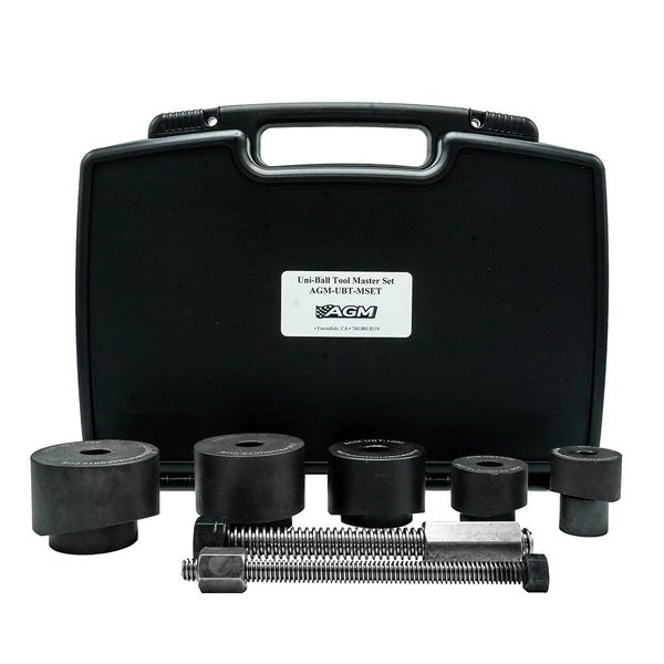 AGM's uni-ball tool's compact size and easy operation allows you to replace a uni-ball without ever having to remove the suspension or steering components from the vehicle. High strength steel construction will give you the reliability to perform the repair over and over again. So whether it's in your shop or alongside the race course, AGM's uni-ball tool is perfect portable solution to uni-ball exchange. Master Uni-Ball Set includes: 7/8in (size 14), 1in (size 16), 11/4 in (size 20) and 11/2 in (size 24) tools. Plus 11/2 in & 3/4 in screw