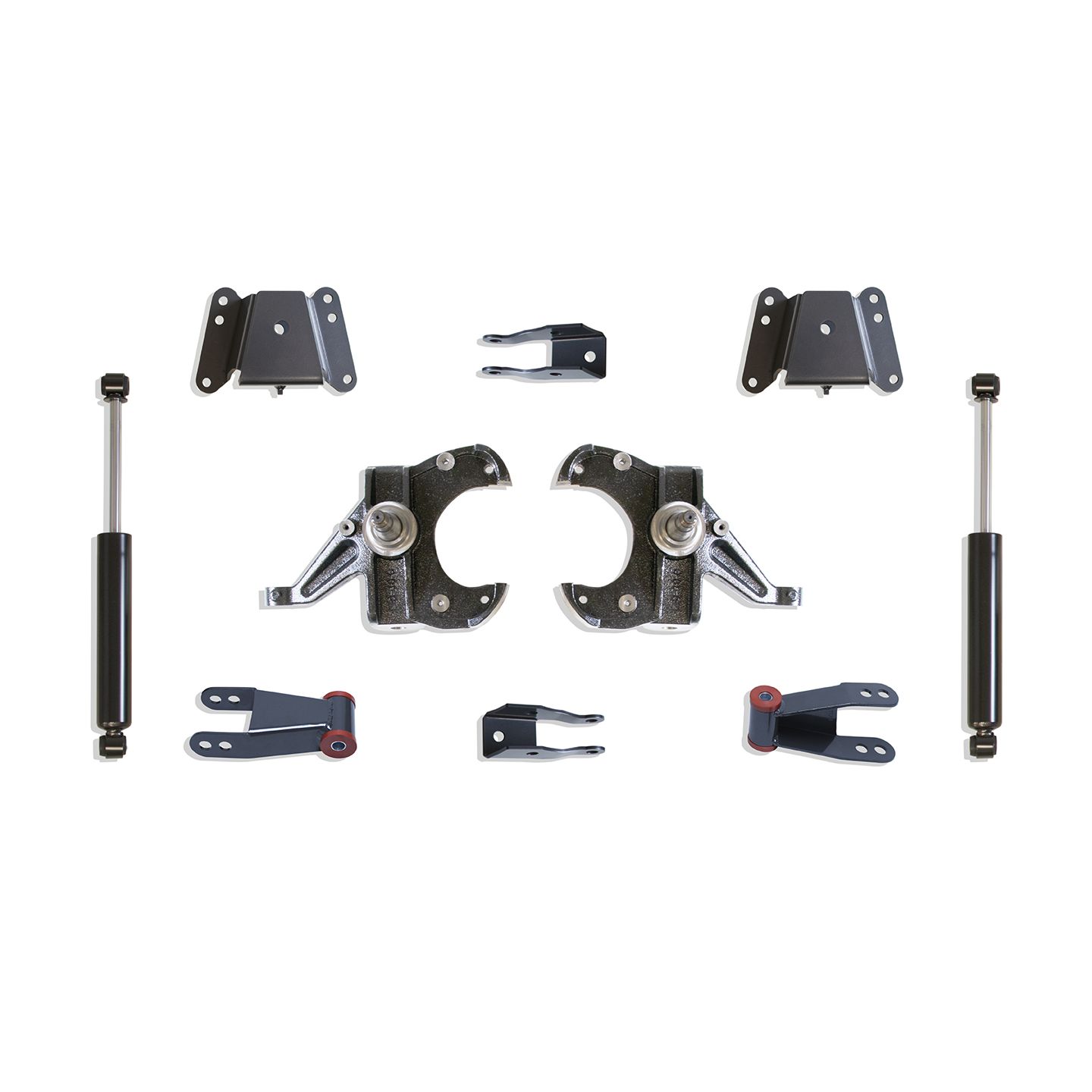 MAX TRAC SUSPENSION'S KIT# KS331134L IS A 2.5"/4" LOWERING KIT INCLUDING LD SPINDLES, HANGERS, SHACKLES, SHOCK ANGLE CORRECTORS & REAR SHOCKS