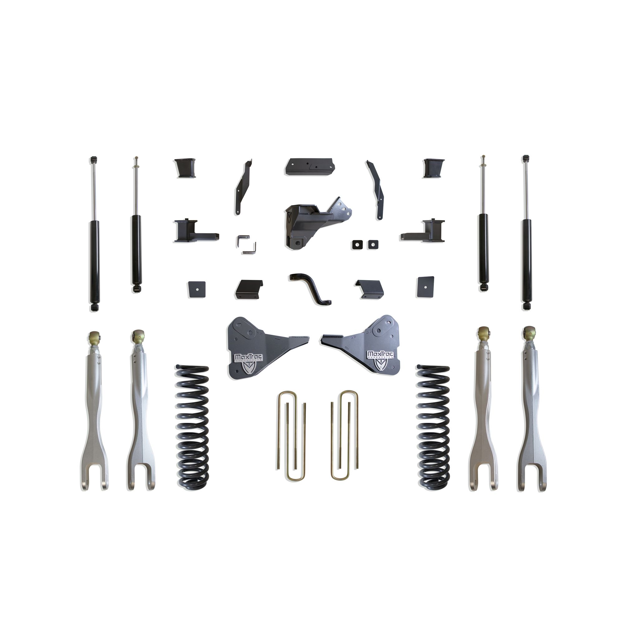 MAX TRAC SUSPENSION'S KIT# K944341L IS A COMPLETE 4" LIFT KIT INCLUDING DIESEL COILS, FORGED ALUMINUM 4 LINKS, TRAC BAR BRACKET, SWAY BAR BRACKETS, BUMP STOP EXTENSIONS, PITMAN ARM, BRAKE LINE BRACKETS, BLOCKS, U-BOLTS & FRONT/REAR MAX TRAC SHOCKS