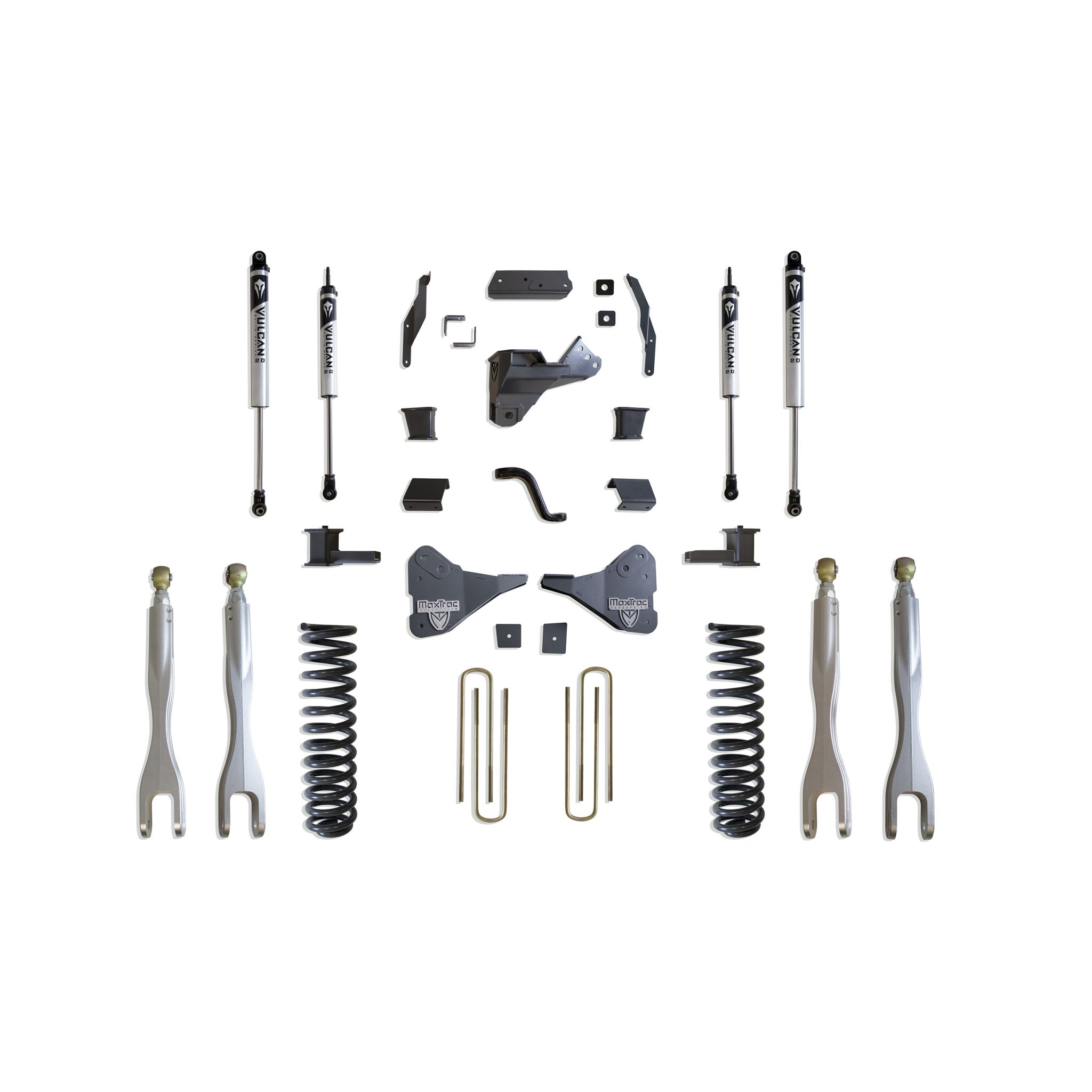 MAX TRAC SUSPENSION'S KIT# K944341VL IS A COMPLETE 4" LIFT KIT INCLUDING DIESEL COILS, FORGED ALUMINUM 4 LINKS, TRAC BAR BRACKET, SWAY BAR BRACKETS, BUMP STOP EXTENSIONS, PITMAN ARM, BRAKE LINE BRACKETS, BLOCKS, U-BOLTS & FRONT/REAR VULCAN SERIES SHOCKS