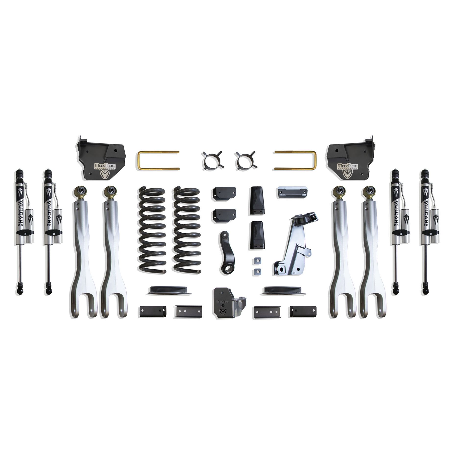 MAX TRAC SUSPENSION'S KIT# K947241VRLA IS A COMPLETE 4" LIFT KIT INCLUDING DIESEL COILS, FORGED ALUMINUM 4 LINKS, TRAC BAR BRACKET, PITMAN ARM, SWAY BAR BRACKETS, BUMP STOPS, REAR AIR BAG SPACERS, TRAC BAR BRACKET, SWAY BAR BRACKETS, BUMP STOP EXTENSIONS & FRONT/REAR VULCAN SERIES SHOCKS