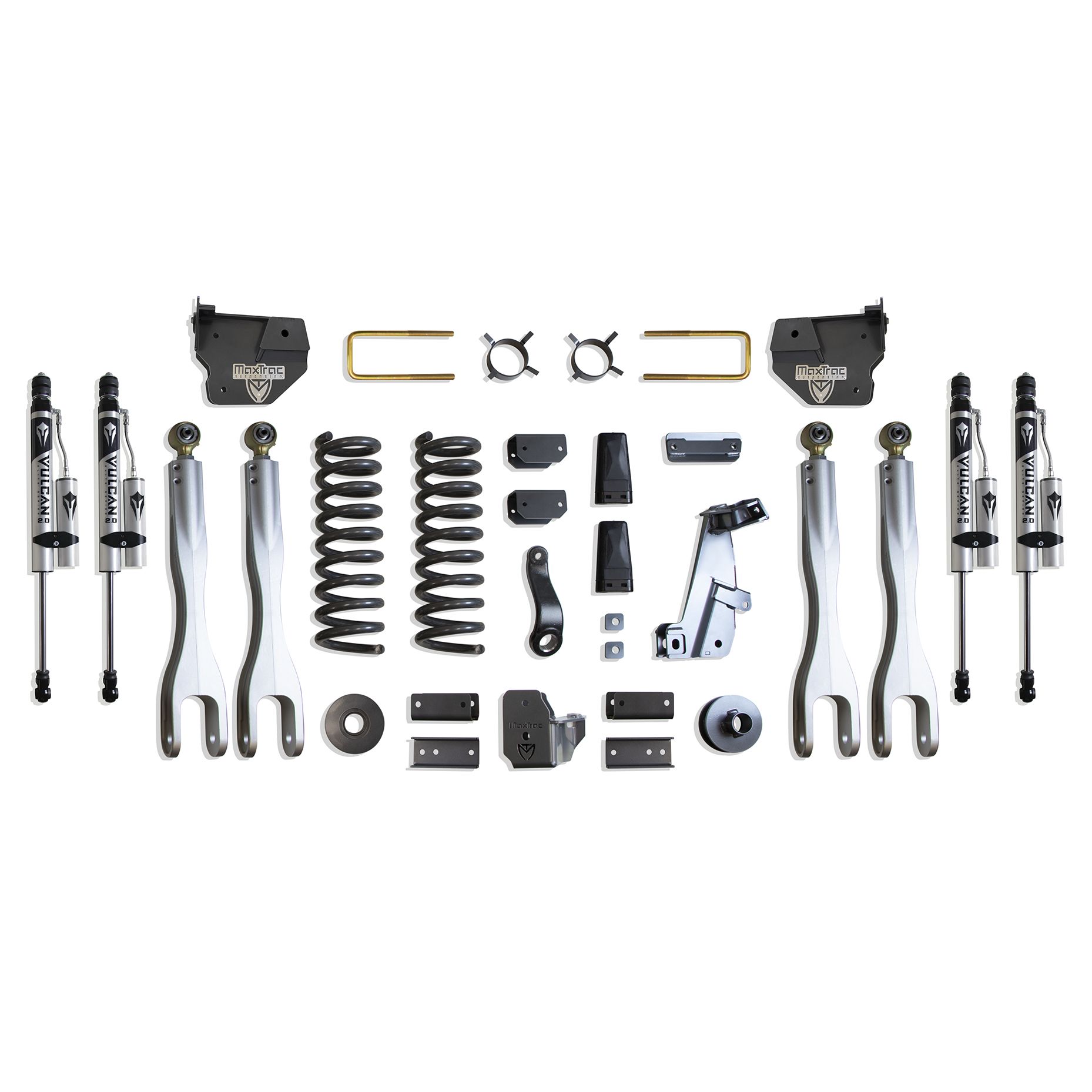 MAX TRAC SUSPENSION'S KIT# K947241VRL IS A COMPLETE 4" LIFT KIT INCLUDING DIESEL COILS, FORGED ALUMINUM 4 LINKS, TRAC BAR BRACKET, PITMAN ARM, SWAY BAR BRACKETS, BUMP STOPS, REAR COIL SPACERS, TRAC BAR BRACKET, SWAY BAR BRACKETS, BUMP STOP EXTENSIONS & FRONT/REAR VULCAN SERIES RESERVOIR SHOCKS