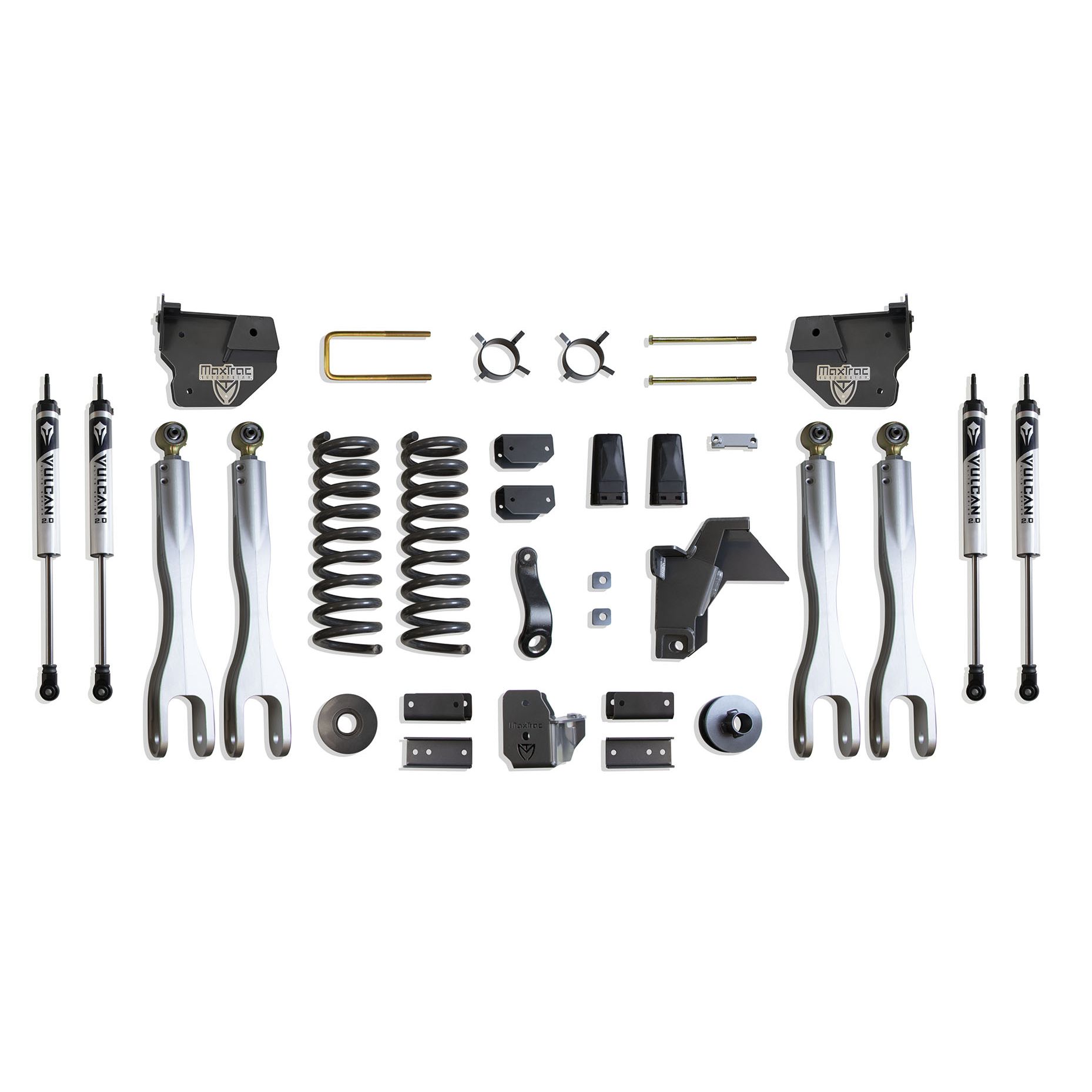 MAX TRAC SUSPENSION'S KIT# K947441VL IS A COMPLETE 4" LIFT KIT INCLUDING DIESEL COILS, FORGED ALUMINUM 4 LINKS, TRAC BAR BRACKET, PITMAN ARM, SWAY BAR BRACKETS, BUMP STOPS, REAR COIL SPACERS, TRAC BAR BRACKET, SWAY BAR BRACKETS, BUMP STOP EXTENSIONS & FRONT/REAR VULCAN SERIES SHOCKS