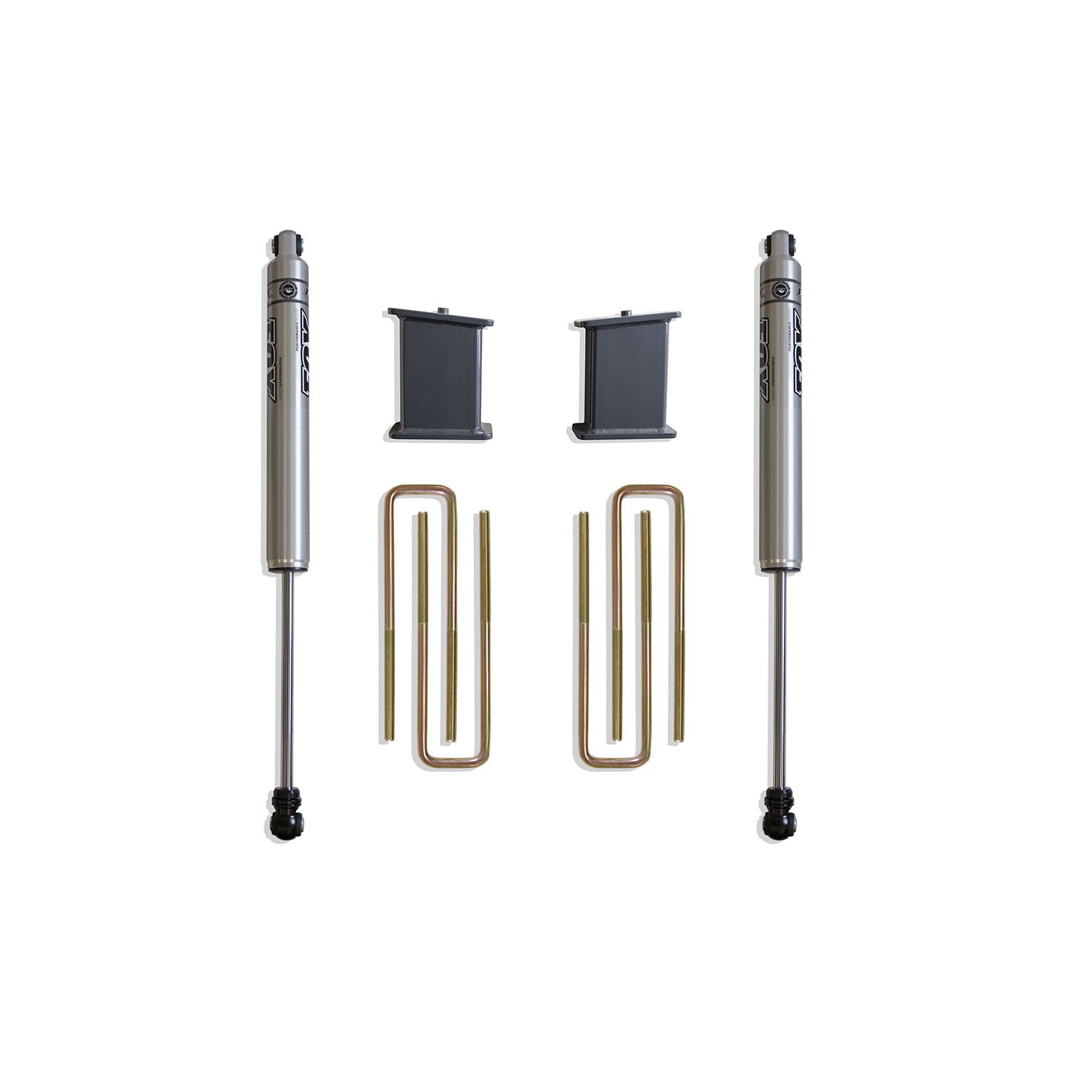 MAX TRAC SUSPENSION'S PART# 901355F IS A REAR BOX KIT INCLUDING 6" LIFT BLOCKS, U-BOLTS & A PAIR OF FOX 2.0 PERFORMANCE SERIES REAR SHOCKS