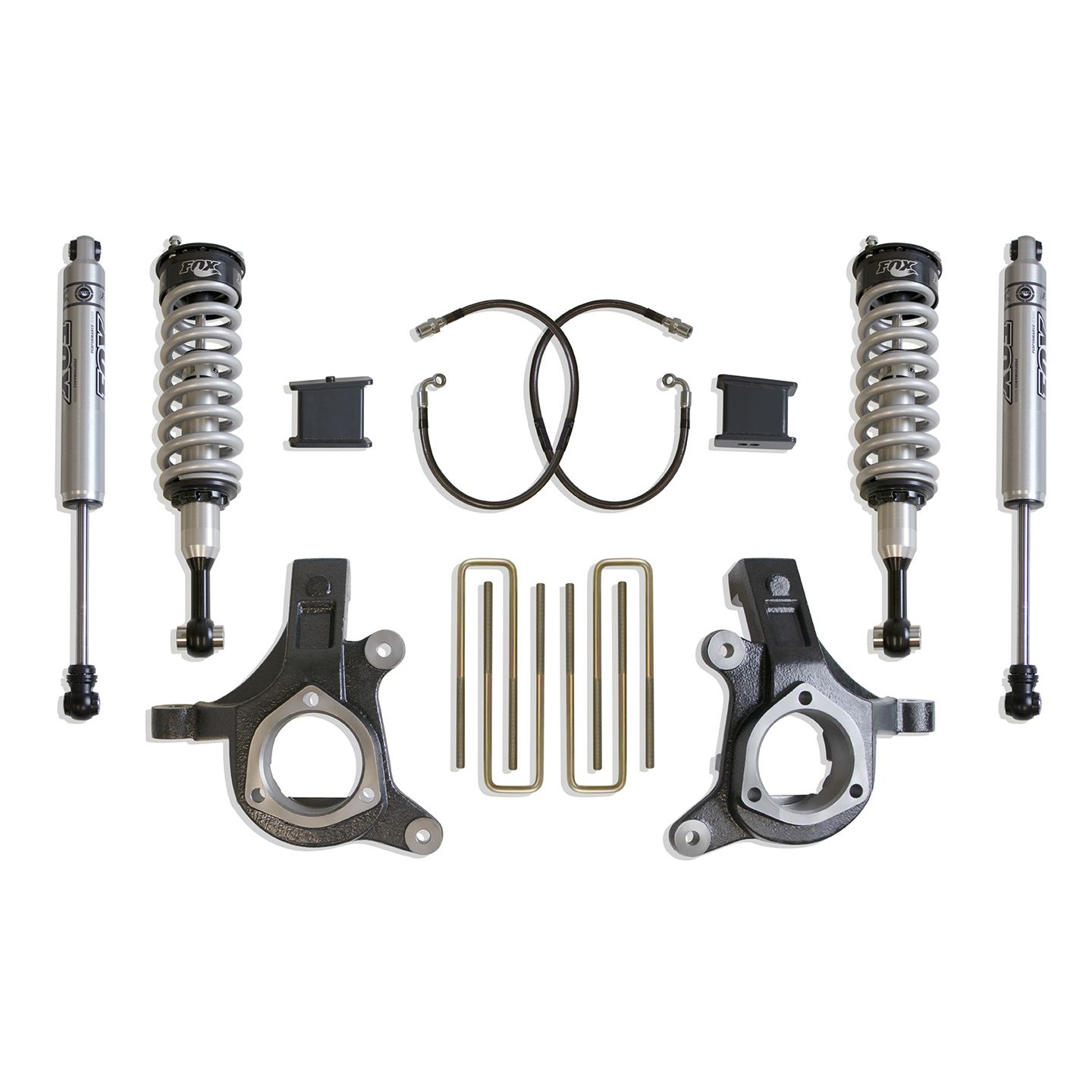 MAX TRAC SUSPENSION'S KIT# K881364F IS A COMPLETE 5.5" LIFT KIT INCLUDING FOX 2.0 PERFORMANCE SERIES COILOVERS, SPINDLES, EXTENDED BRAKE LINES, BLOCKS U-BOLTS & FOX 2.0 PERFORMANCE SERIES REAR SHOCKS