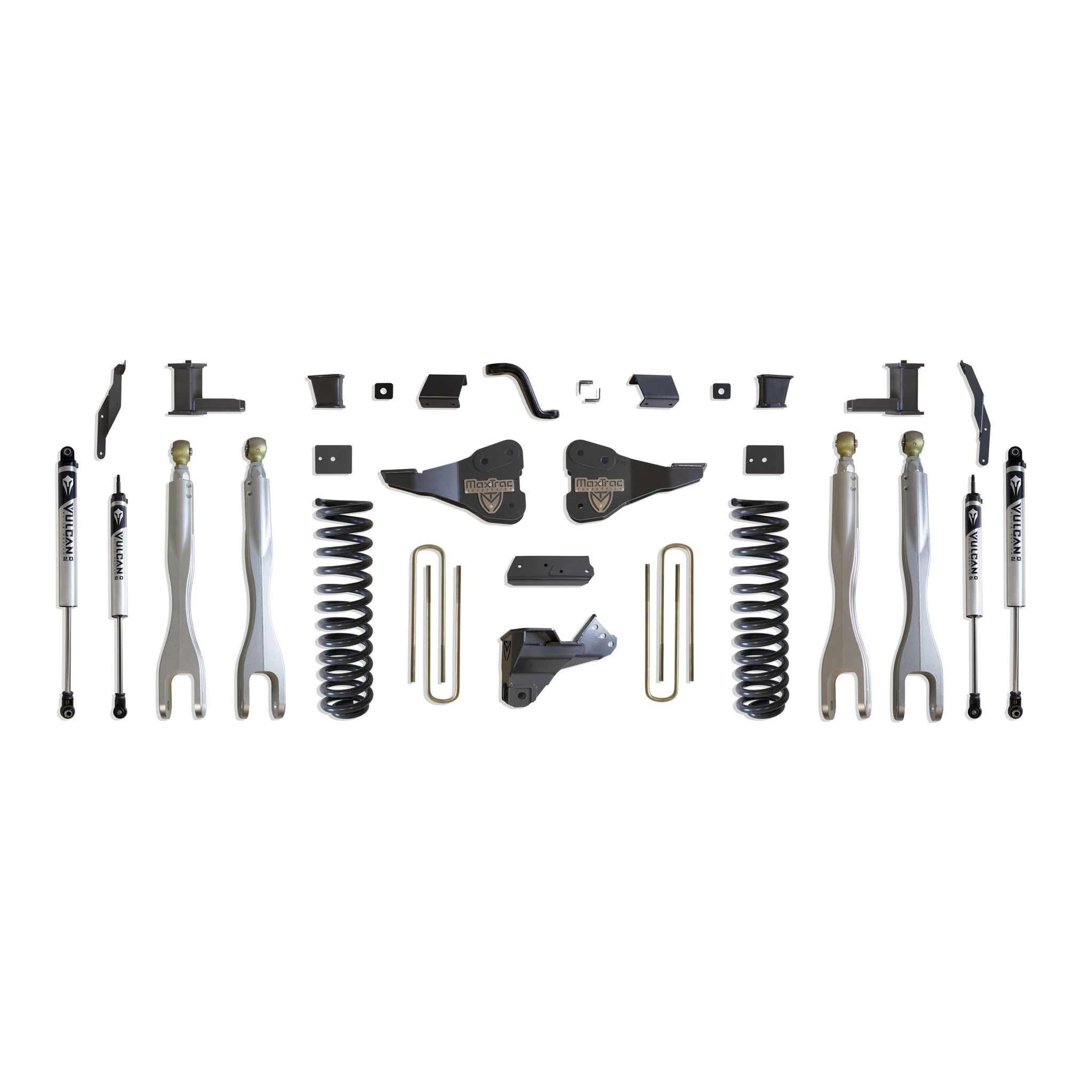 MAX TRAC SUSPENSION'S KIT# K943362VL IS A COMPLETE 6" LIFT KIT INCLUDING DIESEL COILS, FORGED ALUMINUM 4 LINKS, TRAC BAR BRACKET, SWAY BAR BRACKETS, BUMP STOP EXTENSIONS, PITMAN ARM, BRAKE LINE BRACKETS, BLOCKS, U-BOLTS & FRONT/REAR VULCAN SERIES SHOCKS